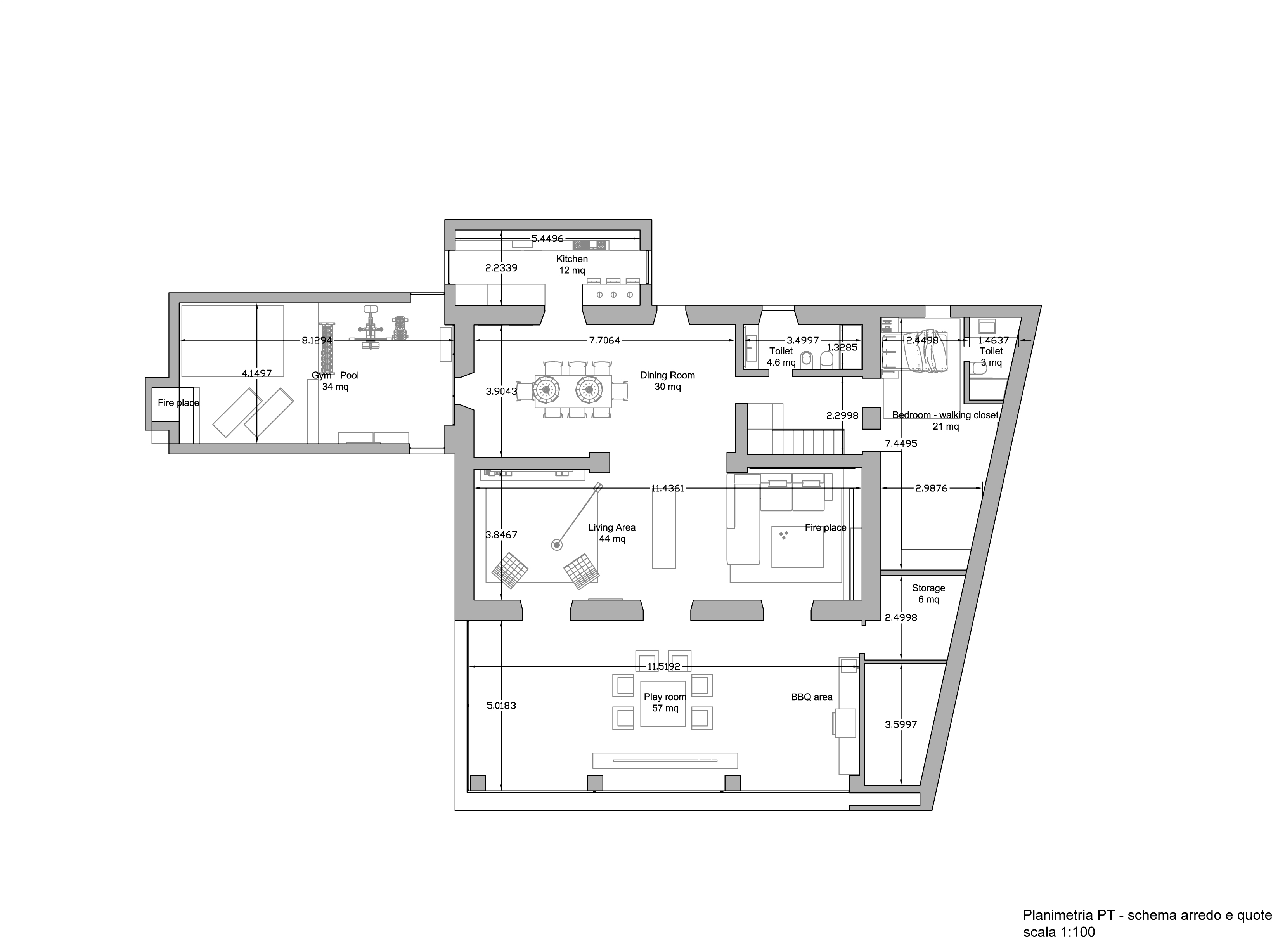 Entrambi i portici che si vedono nelle foto (quello della casa, e quello sito vicino alla piscina), vorremmo chiuderli con delle vetrate scorrevoli. Andranno ristrutturati anche tutti i 4 bagni del casale, sempre in chiave moderna, così come i camini. Inoltre nell'attuale zona pranzo vorremmo fare una piccola palestra e una piscina di 210 cm X 300 cm sita vicino al camino, accompagnati da un divanetto e 2/3 lettini relax. Il tavolo che andremmo a togliere dalla zona pranzo andrà nella parte centrale del salotto ( foto 2). Le facciate esterne in pietra non verranno modificate 'strutturalmente'. Si potranno suggerire 'varianti' moderne nel giardino o nella scala esterna che porta al piano superiore.