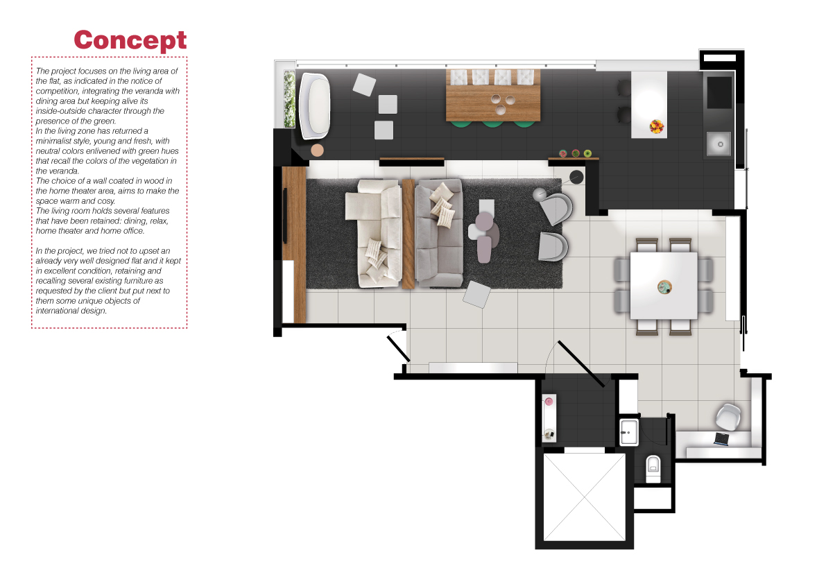 We want to keep the floor but change the walls , lighting and replace the door by a pivot door system.Rooms - divided in 4 spaces: dining room, office , living and home theater.
