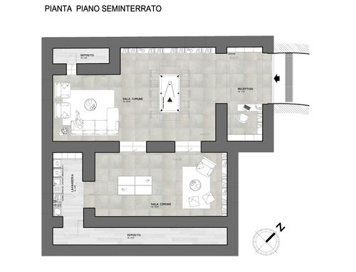 Il piano seminterrato vorremmo dedicarlo a deposito per lenzuola, attrezzi, biancheria pulita e sporca. Inoltre vorremmo prevedere una piccola saletta per lavatrice e asciugatrice, piccola saletta tv e lettura, reception.