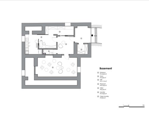 The basement floor we would like to dedicate to storage for sheets, tools, clean and dirty linen. We would also like to provide a small room for washing machine and dryer, small TV and reading room, reception.