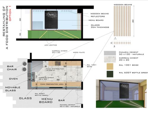 The contest focuses on the restyling of the layout of a food distribution point located in a self service restaurant of a holiday resort.