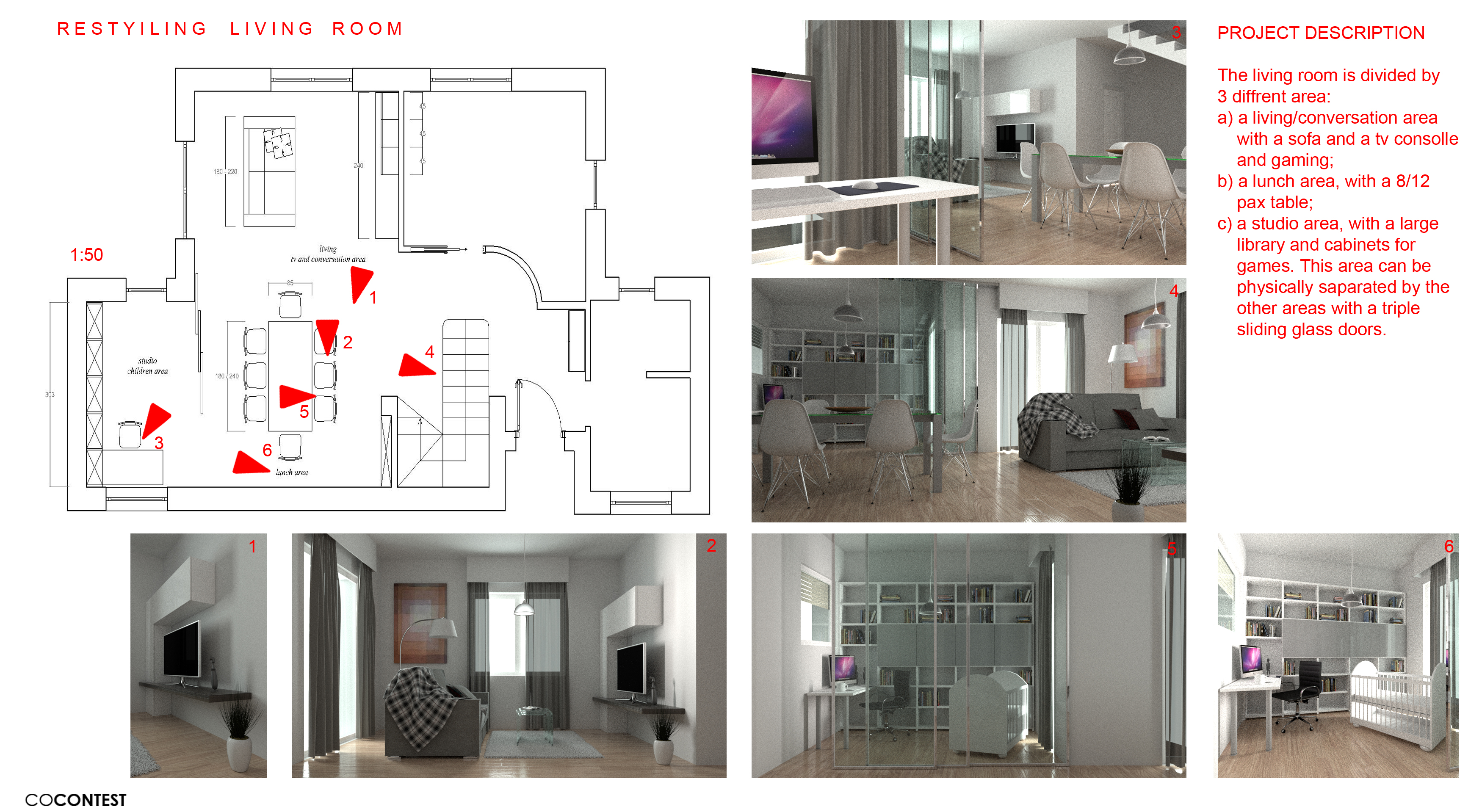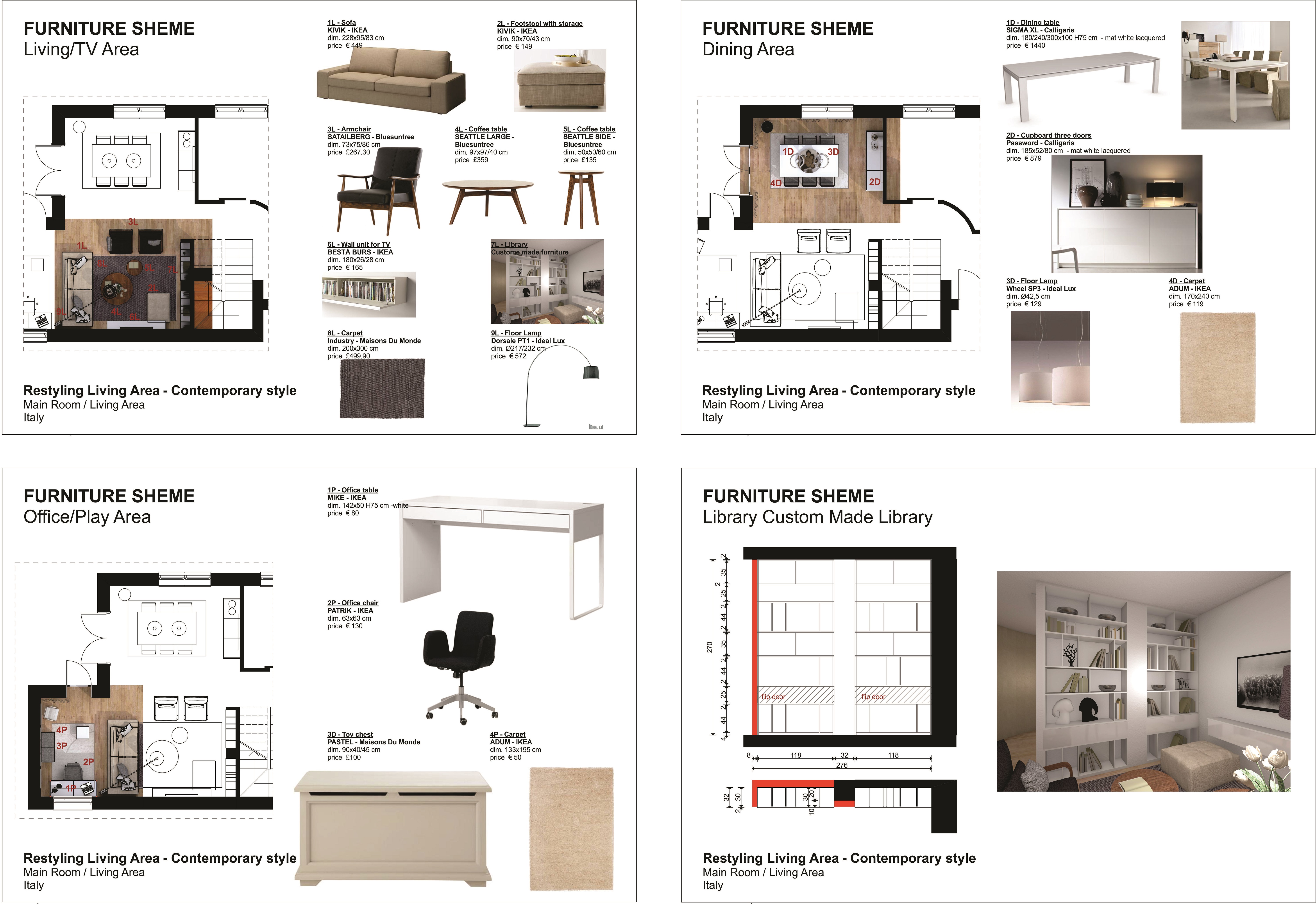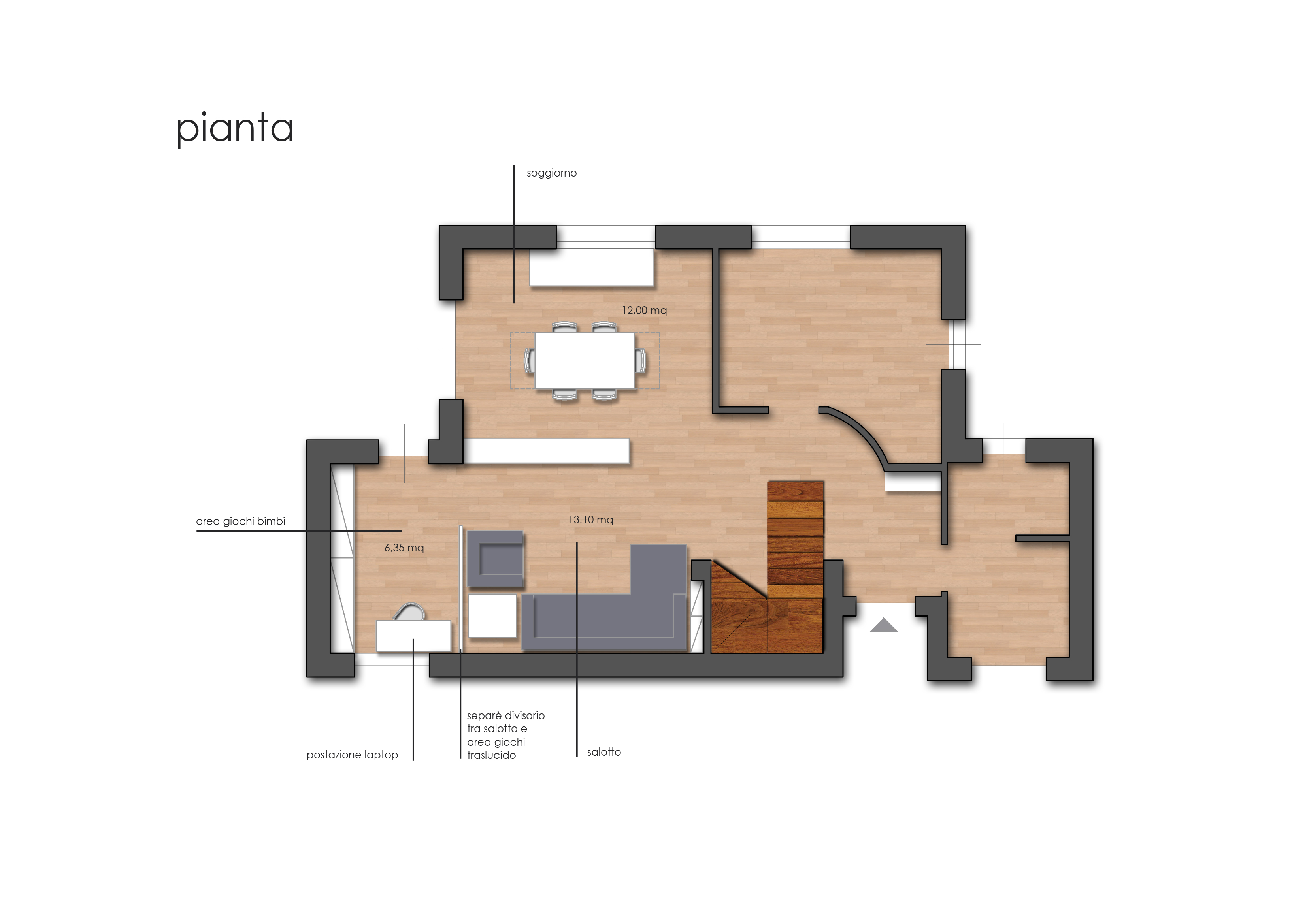 3. Area studio/gioco bimbi. Questa area deve prevedere una piccola postazione Laptop/stampante con arredo funzionale alla gestione di casa (mobile per tenere bollette, documenti, incartamenti vari ecc) ed un angolo per tenere i giochi dei bimbi (oggi in corrispondenza della poltrona grigia - Foto 6 - e della consolle nera - Foto 9)