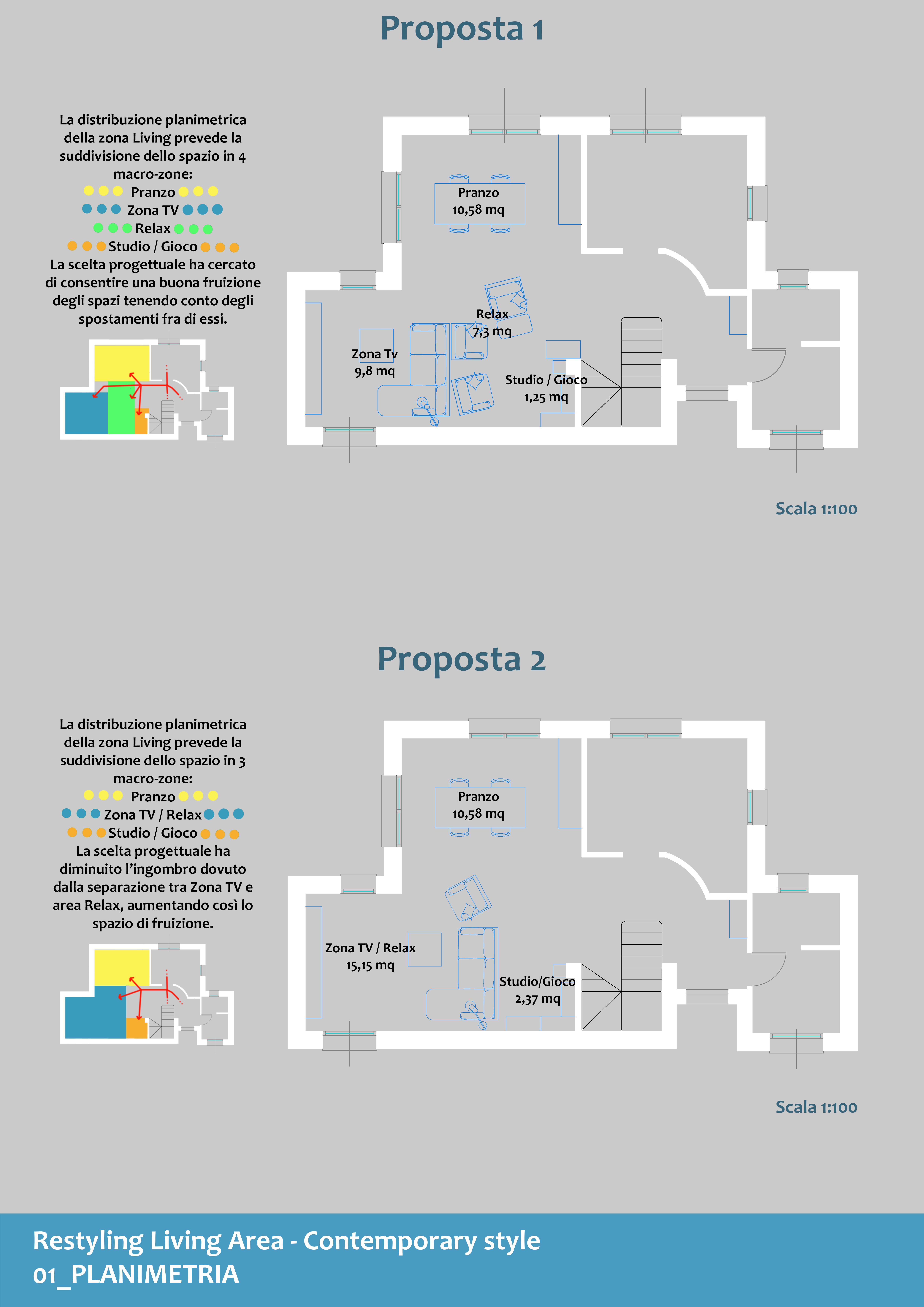 2. Area salotto/TV. Area con divano/i comodo/i - pouff - poltrone per vedere TV o per accogliere ospiti e fare due chiacchiere. Individuare un posizionamento della TV funzionale.