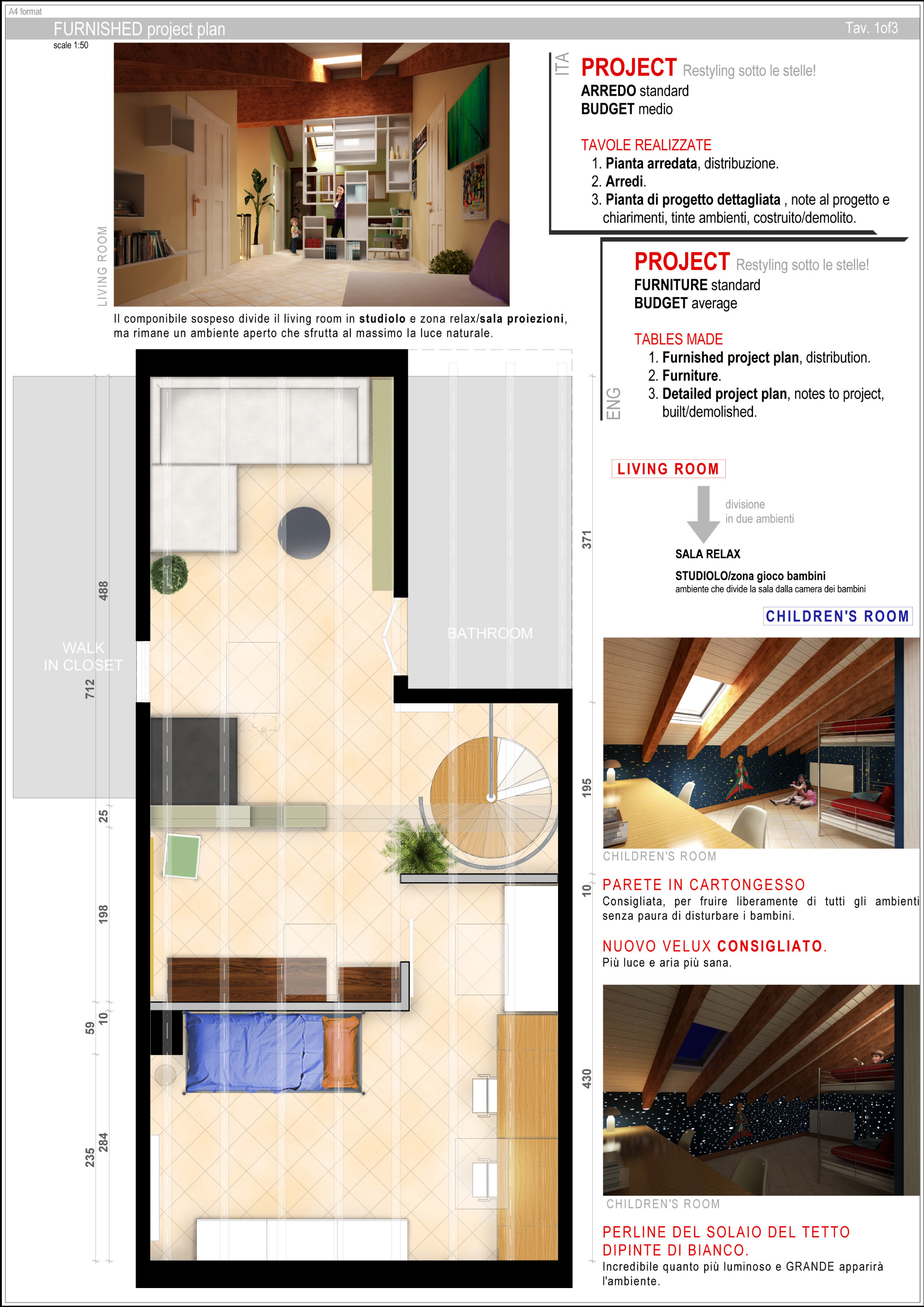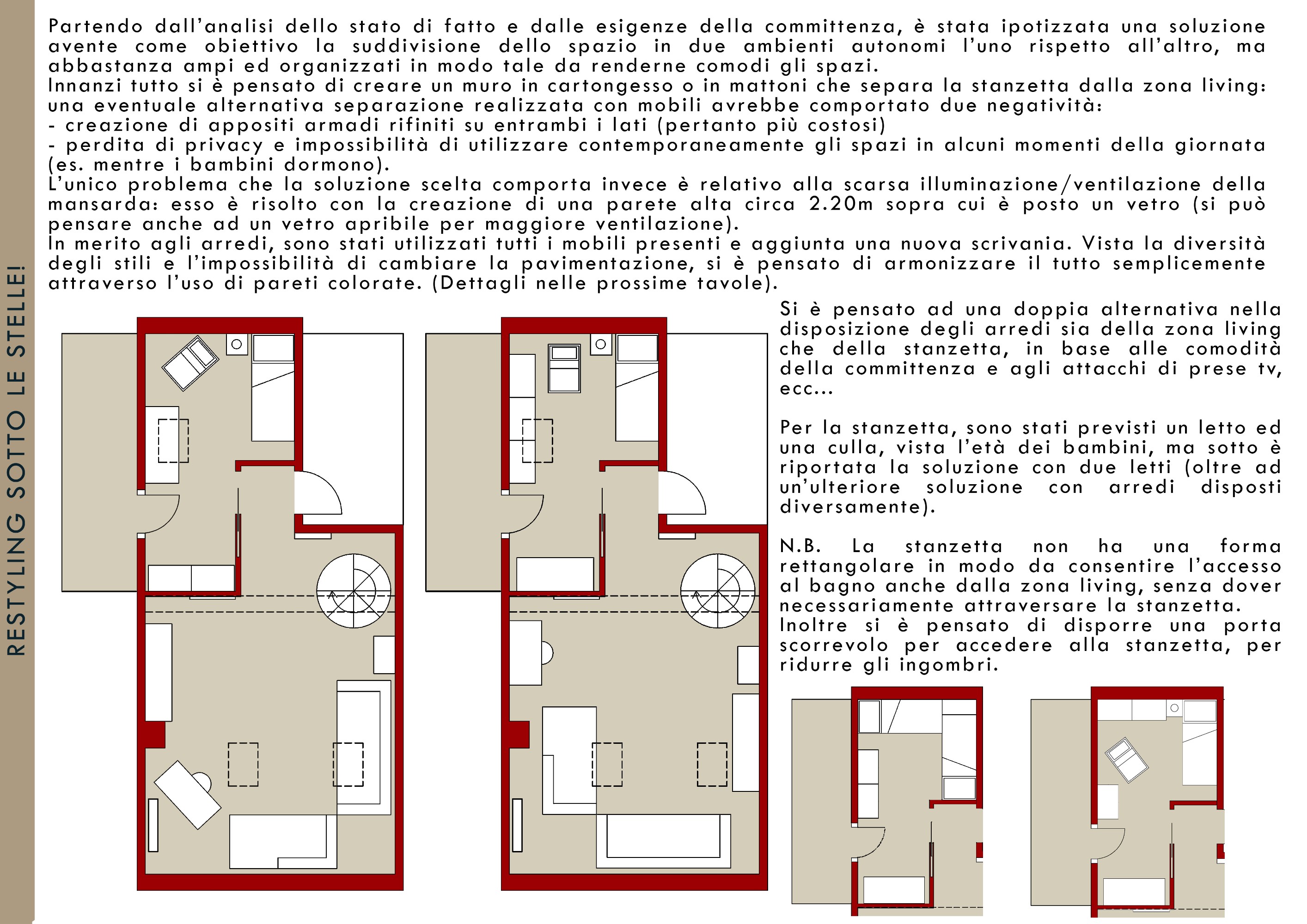 La mansarda attualmente e' composta da un'ambiente unico dove e' presente una zona relax/living,una cabina armadio ed un bagno.E' necessario un cambiamento o parziale (zona living/zona notte cameretta bimbi per non sconvolgere troppo l'ambiente e per avere la possibilita' di uno sfogo sia per i bimbi che per i genitori nei momenti di relax),o totale (siamo molto combattuti dalla possibilita' di creare la zona notte per tutta la famiglia camera matrimoniale e cameretta bimbi).Tutto il progetto e' condizionato dalla presenza di una scala a chiocciola con tutti i limiti logistici che ne comporta nella valutazione della scelta dei mobili/letti etc...!