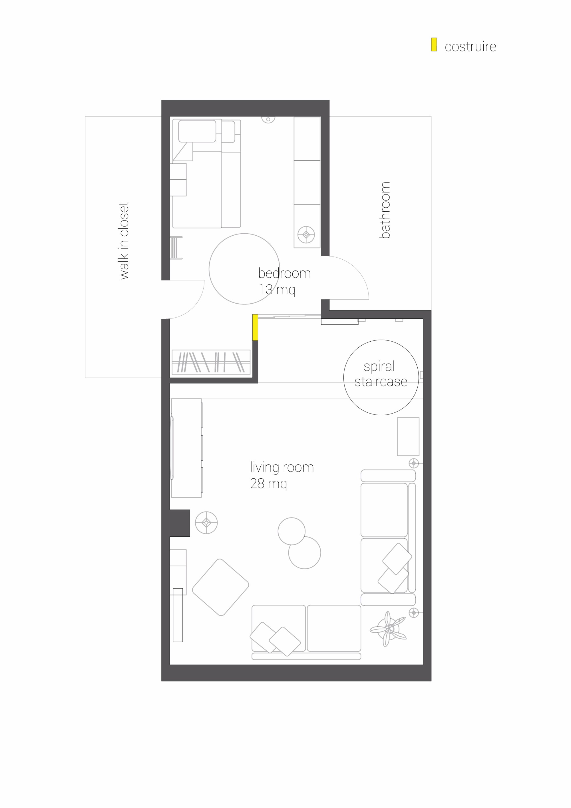 There are two options to choose from: 1) divide the space and creating a living area and the bedroom for the children, so as not to upset the environment and maintain the ability to have a space to relax, both for children and for the parents. 2) move the entire sleeping area to the attic, with both the master bedroom and the children's room. The whole project is conditioned by the presence of a spiral staircase with all the logistical constraints that it entails in the choice of furnishings.