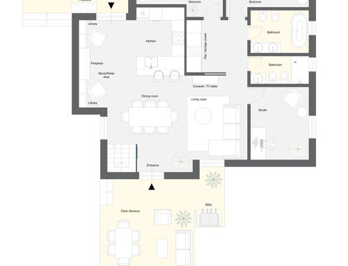 Odiamo archi e pavimento in cotto, che andranno smantellati durante i lavori. Amiamo uno stile moderno e luminoso; vorremmo dare spazio ai nostri numerosi libri ed avere uno spazio da dedicare alla lettura con comodi divani attorno al camino. No TV.