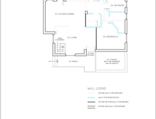 L’immobile purtroppo non è dotato di isolamento acustico congruo (e di vicini educati!) sui solai quindi avremo necessità di installare un controsoffitto fonoisolante su tutta la superficie, ovviamente anche le pareti divisorie della nuova disposizione dovranno tenere conto di requisiti acustici. Si possono demolire tutti i tramezzi tranne il pilastro portante in mezzo alla casa.