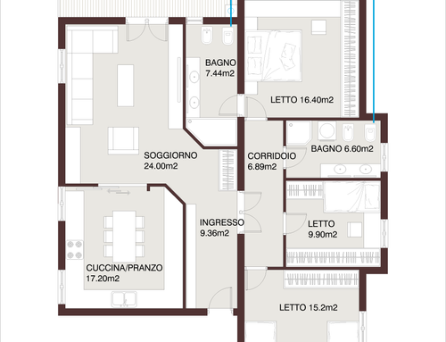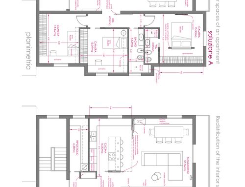 Se desea renovar completamente este piso de los años 70, dándole un toque moderno. Nos gustaría obtener una amplia zona de estar con una cocina acristalada con vistas a la sala de estar adyacente al balcón; también nos gustaría obtener un pequeño trastero adyacente a la escalera. En la zona de noche, también desplazando la abertura del muro de carga, nos gustaría obtener 3 dormitorios, de los cuales uno doble y 2 individuales de igual tamaño. Además, nos gustaría obtener dos cuartos de baño, uno de los cuales pertenece al dormitorio principal, de nuevo en correspondencia con el existente.