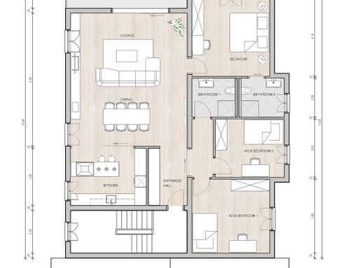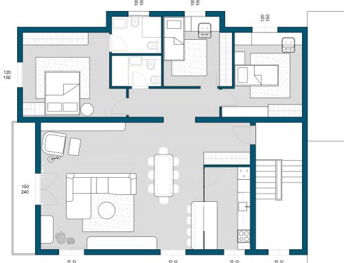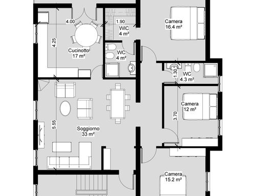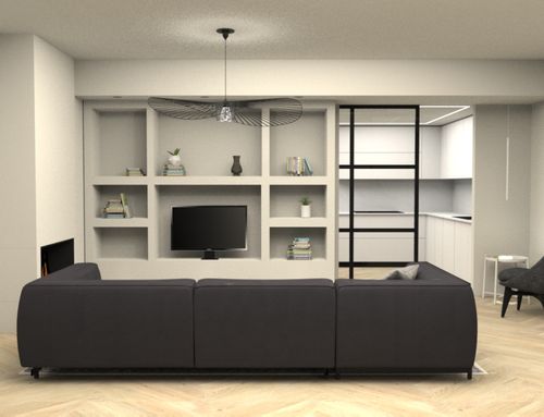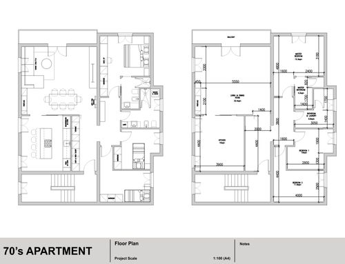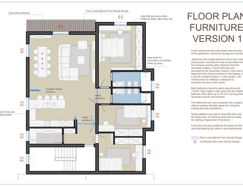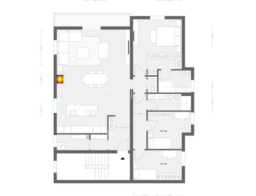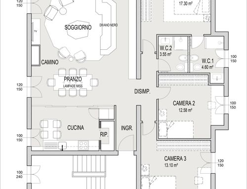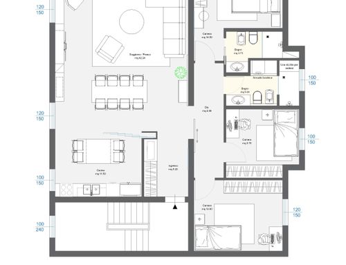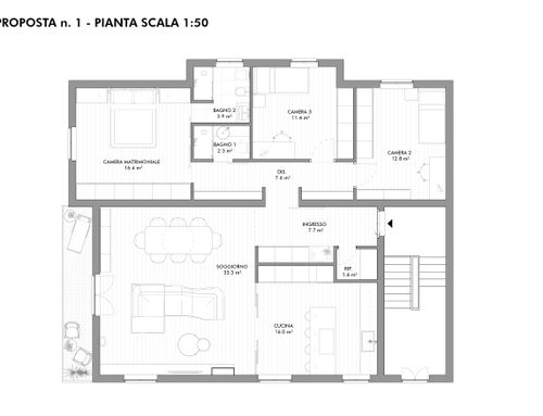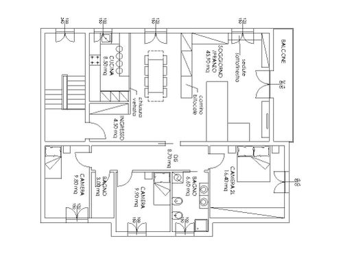 Si vuole procedere al completo rinnovamento di questo appartamento degli anni 70 rivisitandolo in chiave moderna. Si vorrebbe ottenere un ampia zona giorno con cucina chiusa con vetrate e vista sul soggiorno adiacente al balcone; si vorrebbe ricavare anche un piccolo ripostiglio in adiacenza alla scala. Nella zona notte, anche spostando l'apertura sul muro portante, si vorrebbero ottenere 3 camere di cui una matrimoniale e 2 singole di uguali dimensioni. Inoltre si vorrebbero ottenere due bagni, di cui uno di pertinenza della camera matrimoniale, sempre in corrispondenza di quello esistente. La proprietà vorrebbe recuperare un divano di colore nero con penisola a destra di dimensioni 330x117,5 , una lampada Banner di Davide Groppi e n. 4 lampade Miss di Davide Groppi (allego le immagini di riferimento).