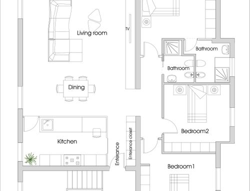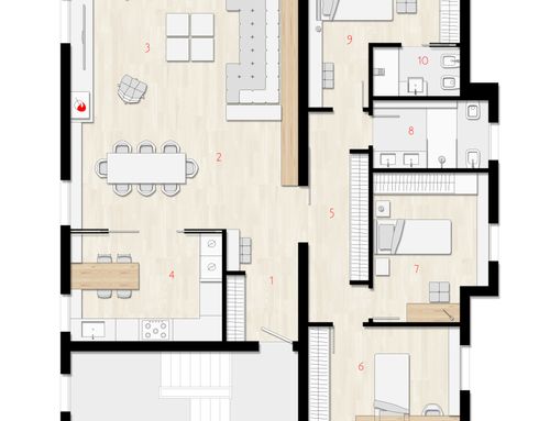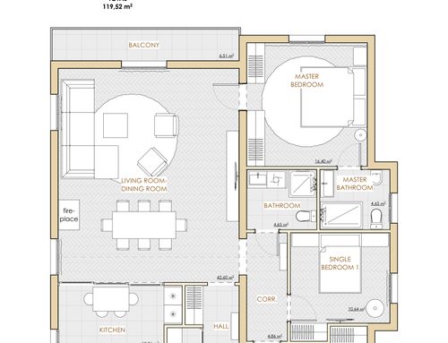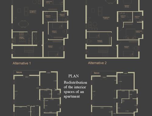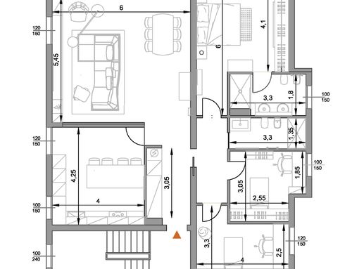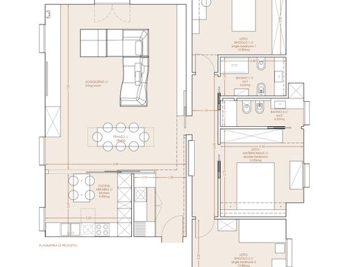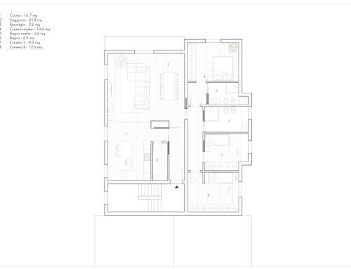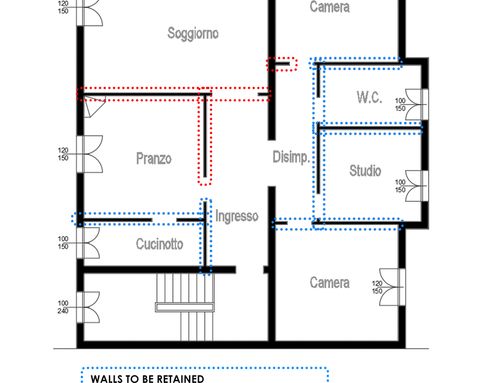 We want to proceed with the complete renovation of this apartment from the 70s revisiting it in a modern key. We would like to obtain a large living area with a closed kitchen with windows and a view of the living room adjacent to the balcony; we would also like to obtain a small closet adjacent to the staircase. In the sleeping area, also by moving the opening on the load-bearing wall, we would like to obtain 3 bedrooms, one of which is a double and 2 singles of the same size. Furthermore, two bathrooms would be obtained, one of which pertaining to the master bedroom, always in correspondence with the existing one.