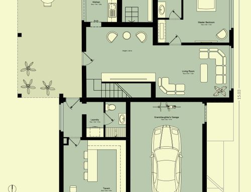 o A) larger house: the granddaughter should have a kitchen + living room (not necessarily separate), overlooking the beautiful garden, 3 bedrooms and two bathrooms, at least a space for the laundry in the tavern, if there was a shower it would be better