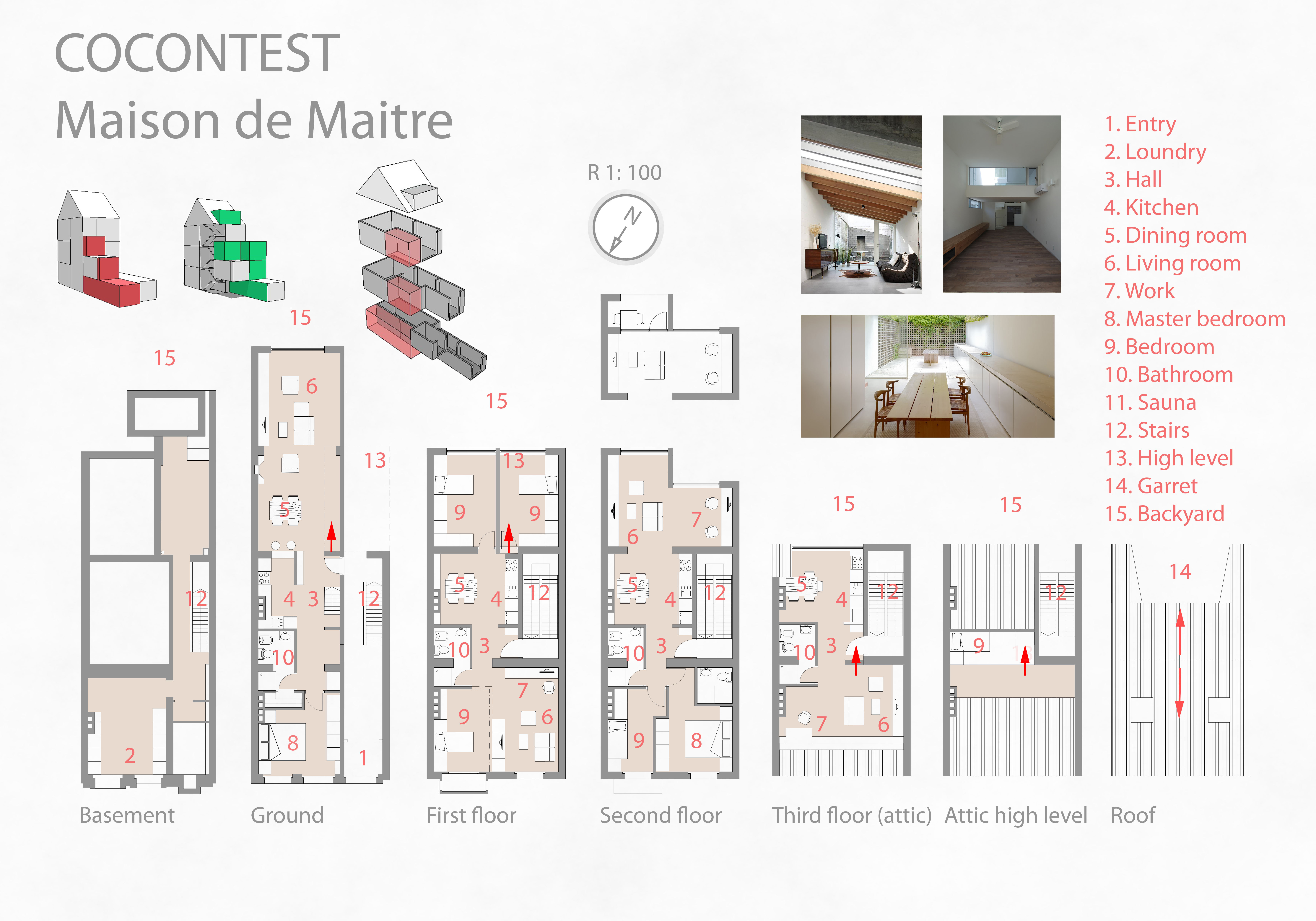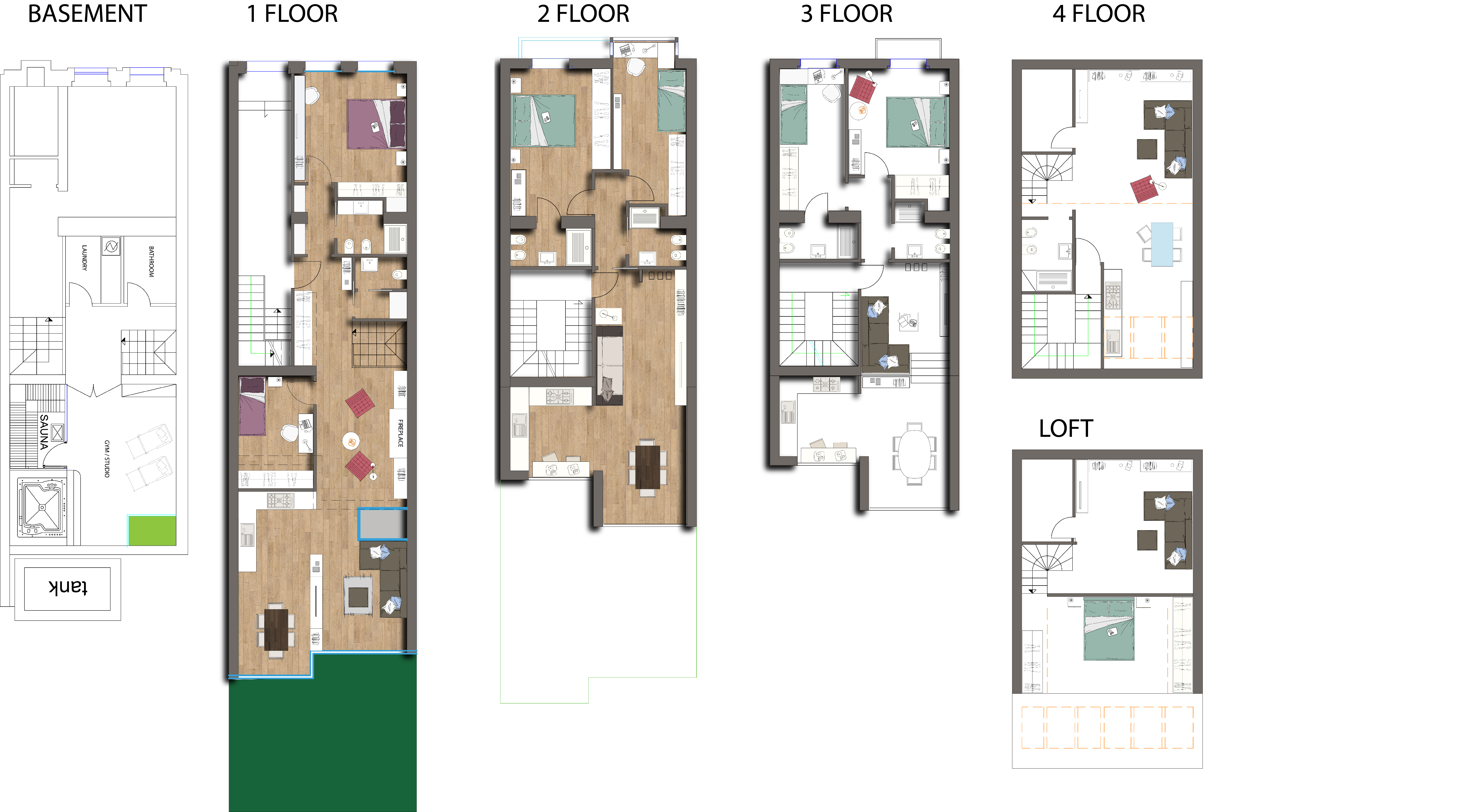 Needs and goals: to divide the house floors in a modular way, that it can be used in separate units (4 individual apartments) or as integral parts of a single unit (adding one or more modules at a time always continuously complementary).