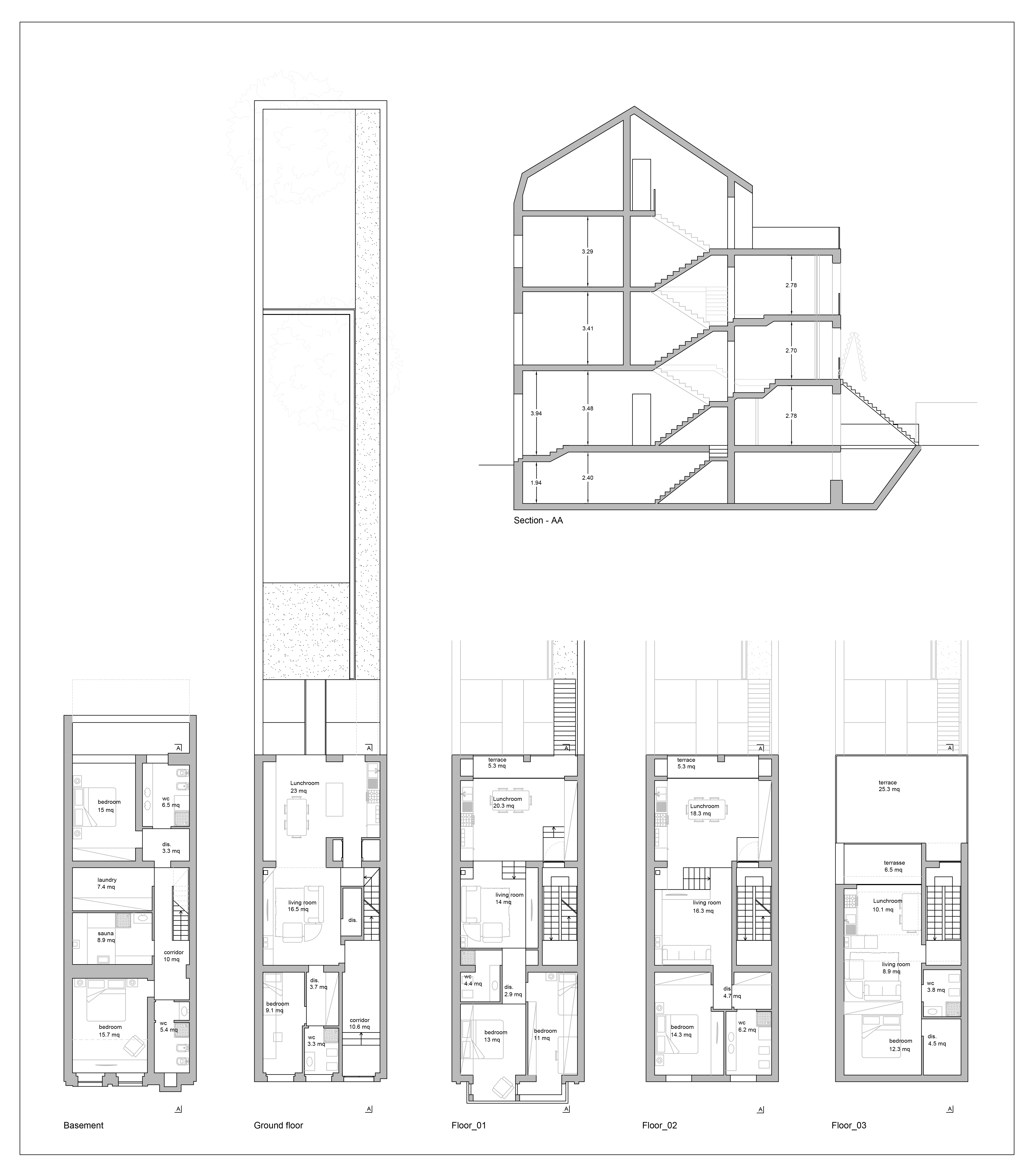 It is planned volume extension of the house at the back, up to the limit of the house more protruding as evidenced by the photos and the sketch (3 x 3 x 3 = 4.5 + 22.5 sqm for 3 levels starting with the ground floor). In the design of the new part should be taken into account that the maximum height to be divided into 3 floors is 'little more' than 9 meters (as from sections attached) and therefore the floors of the new part can not have the same height as the old floors and must be at a different level than the main floors.