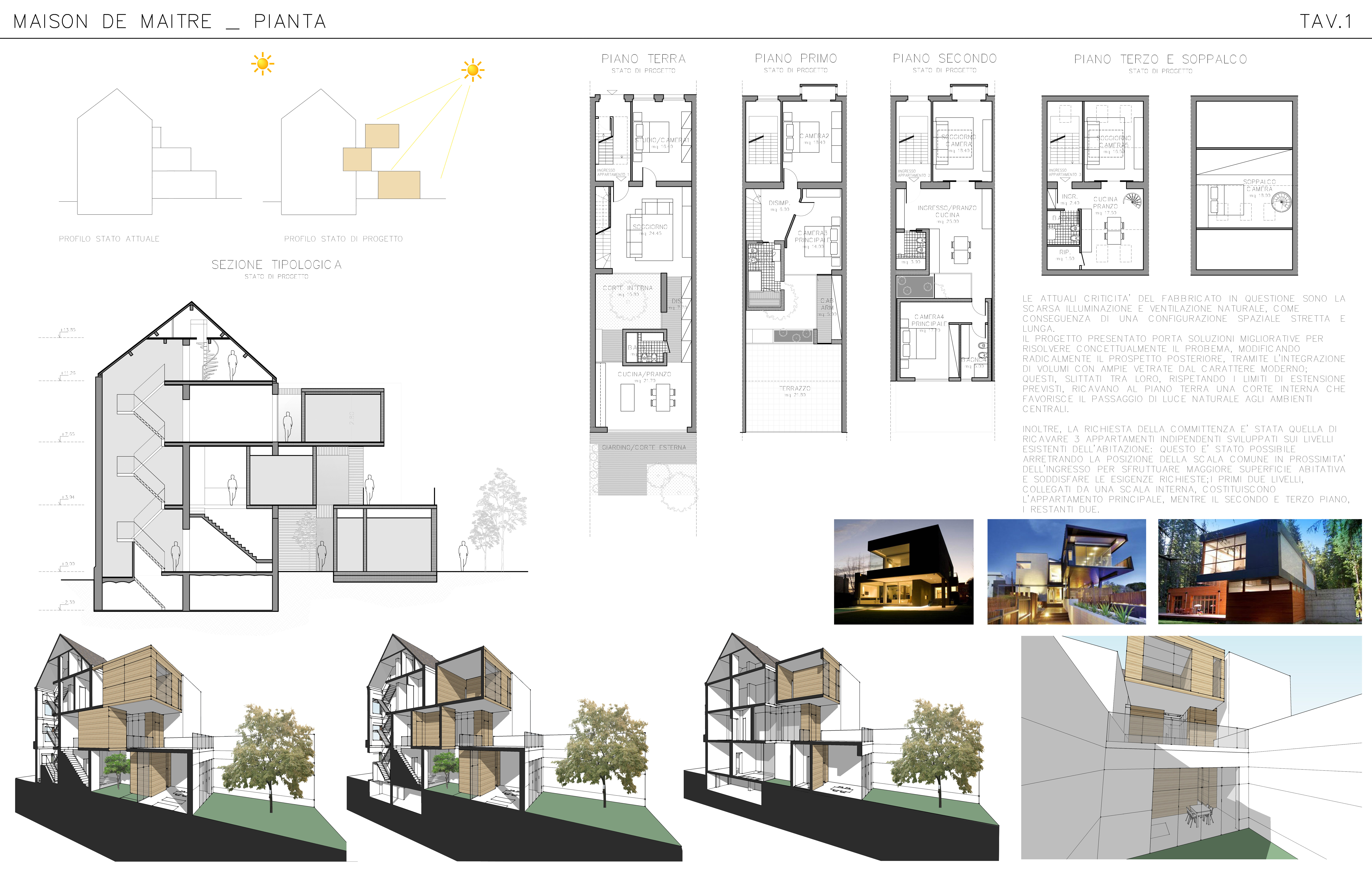 Bisogni ed obiettivi: dividere la casa per piani in maniera modulare, da poter essere usata in unità separate (4 appartamenti singoli) o come parti integranti di una sola unità (aggiungendo 1 o più moduli alla volta sempre contiguamente complementari).