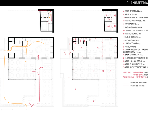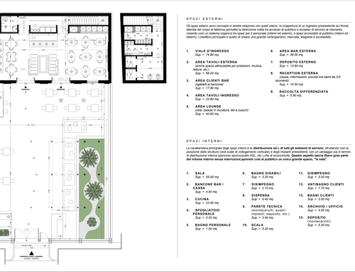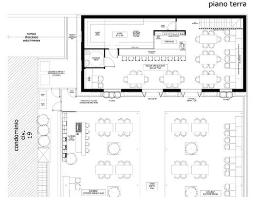 Esternamente tutta la zona che parte dalle mura del locale e finisce ai cancelli sarĂ destinata a tavoli per consumazioni, area lounge, bancone bar esterno e reception esterna (andrĂ fatta vicino all'ingresso del cortile) andrĂ inoltre rifatta tutta la pavimentazione.