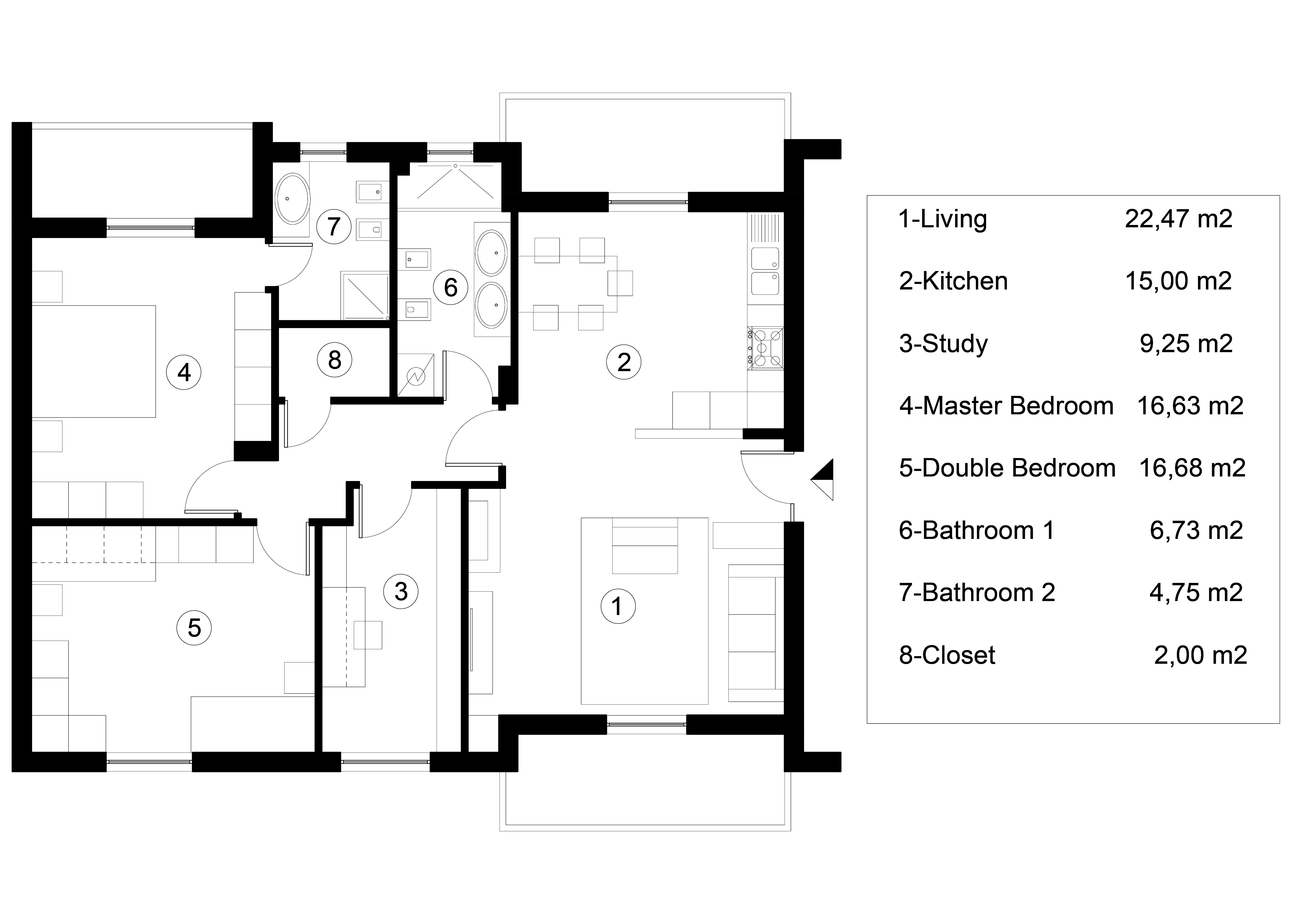 House it is 114 mq. 7 windows , 3 decks. House have 1 big living room with kichen , one bathroom, e 3 bed rooms.