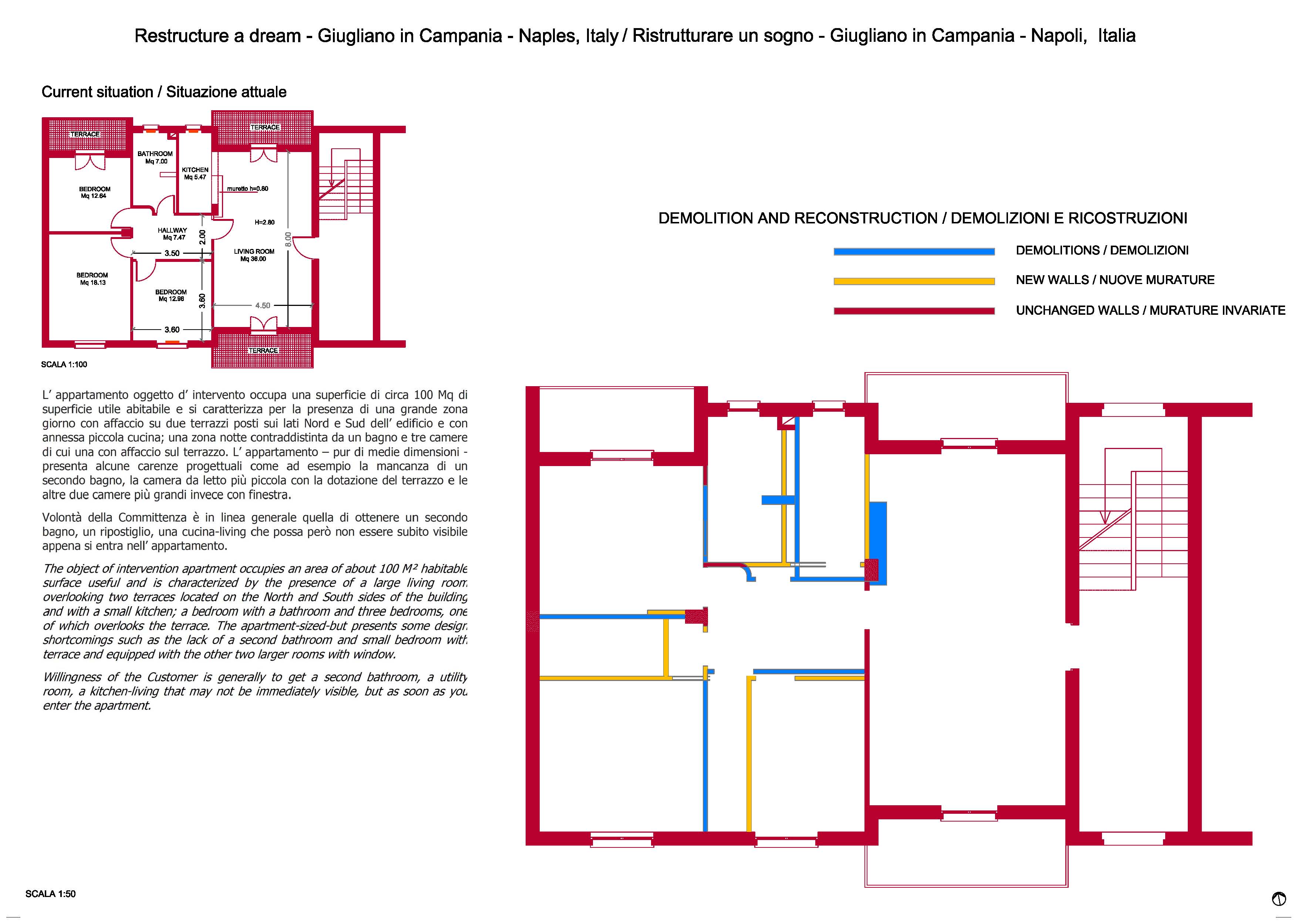 E' un appartamento che prevedeva un unico ambiente salone/cucina living 3 stanze e 2 bagni ( 1 è stato rimosso per allargare la cucina dai precedenti proprietari).
