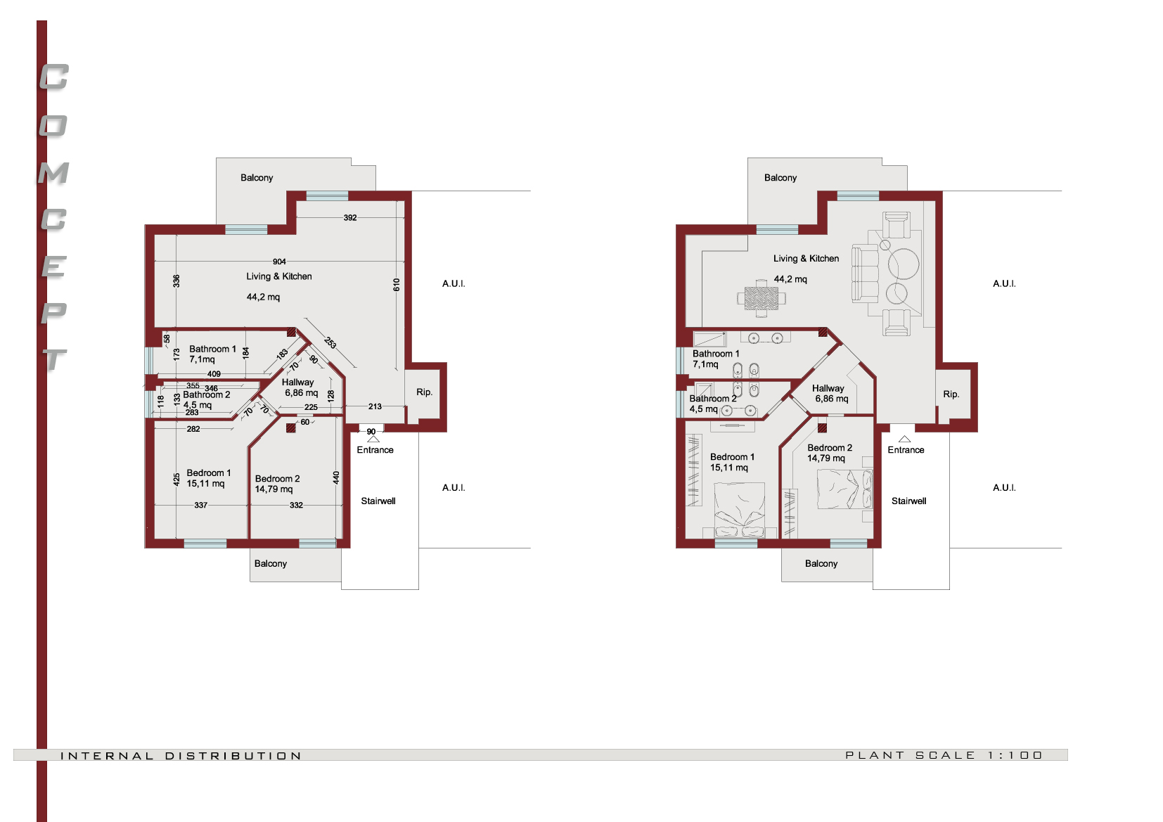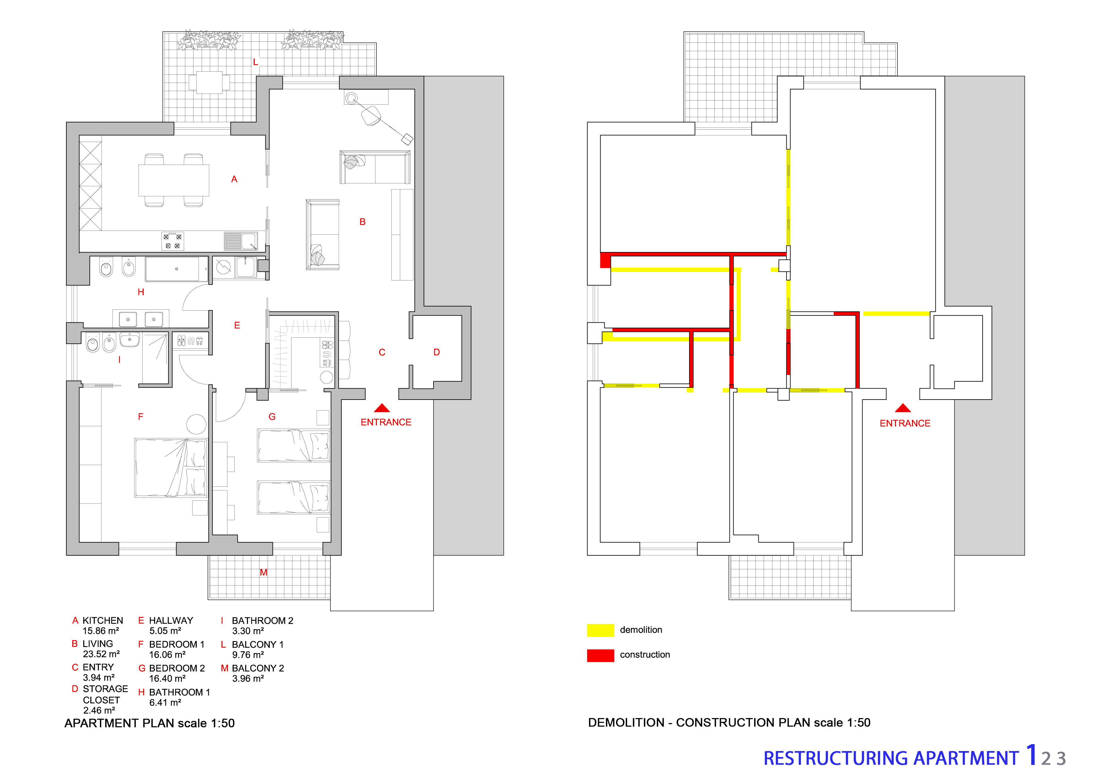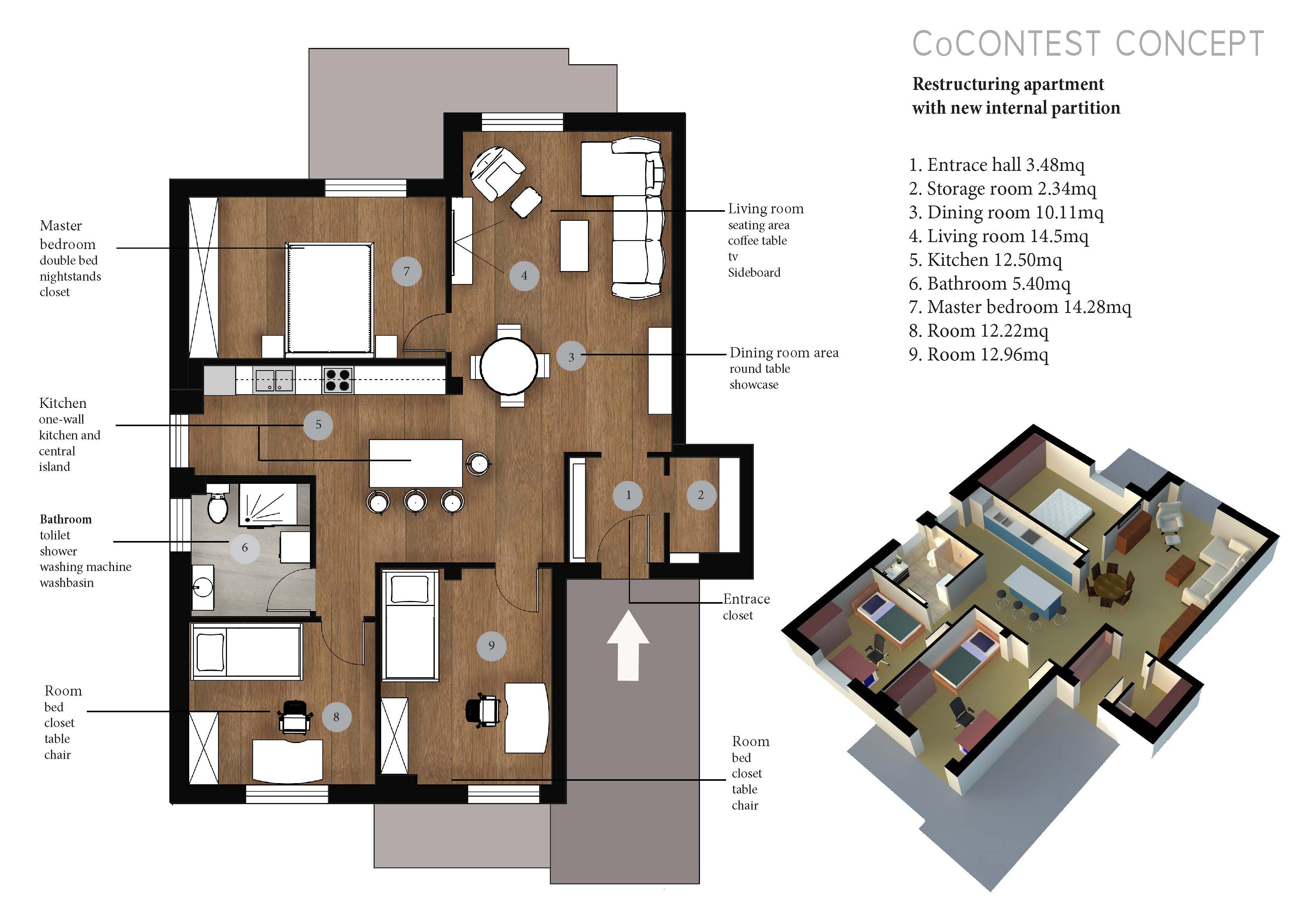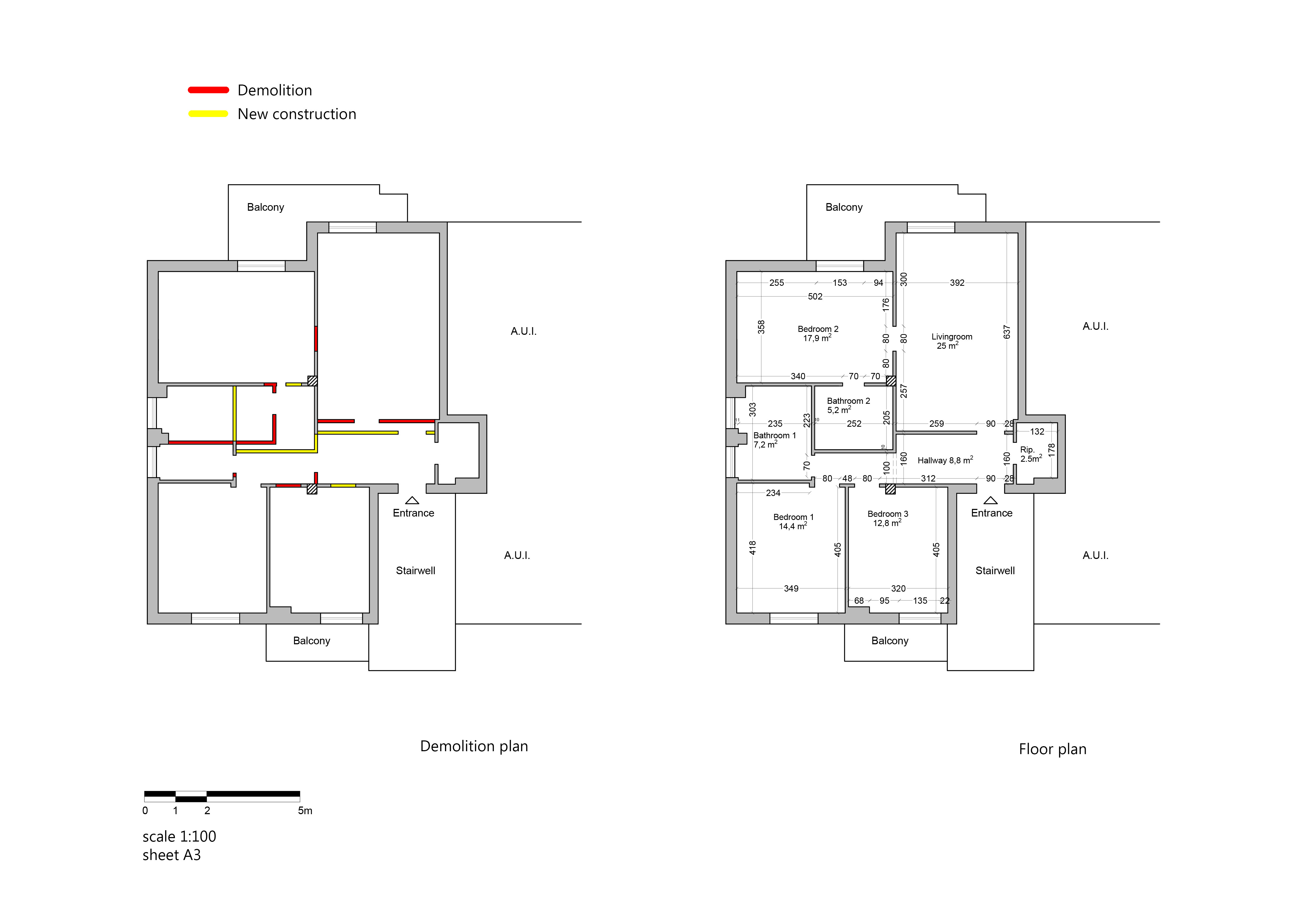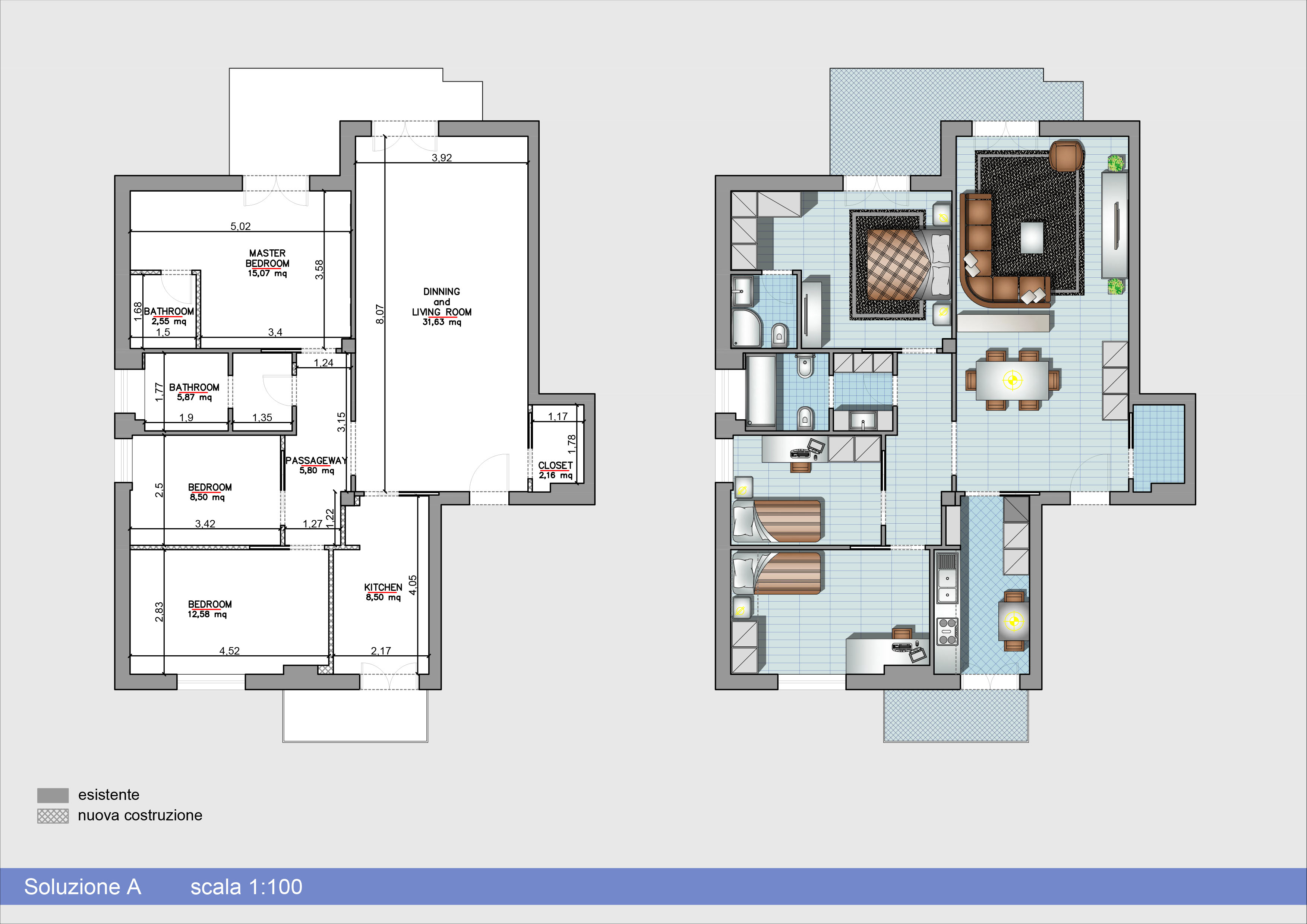 Specifically, we are evaluating alternative solutions to renovate an apartment of the seventies about 100 square meters over balconies trade in order to maximize the space now occupied from the large hallway in order to derive an additional bedroom ( prospects of the building and therefore the position, number and size of windows can not be modified).