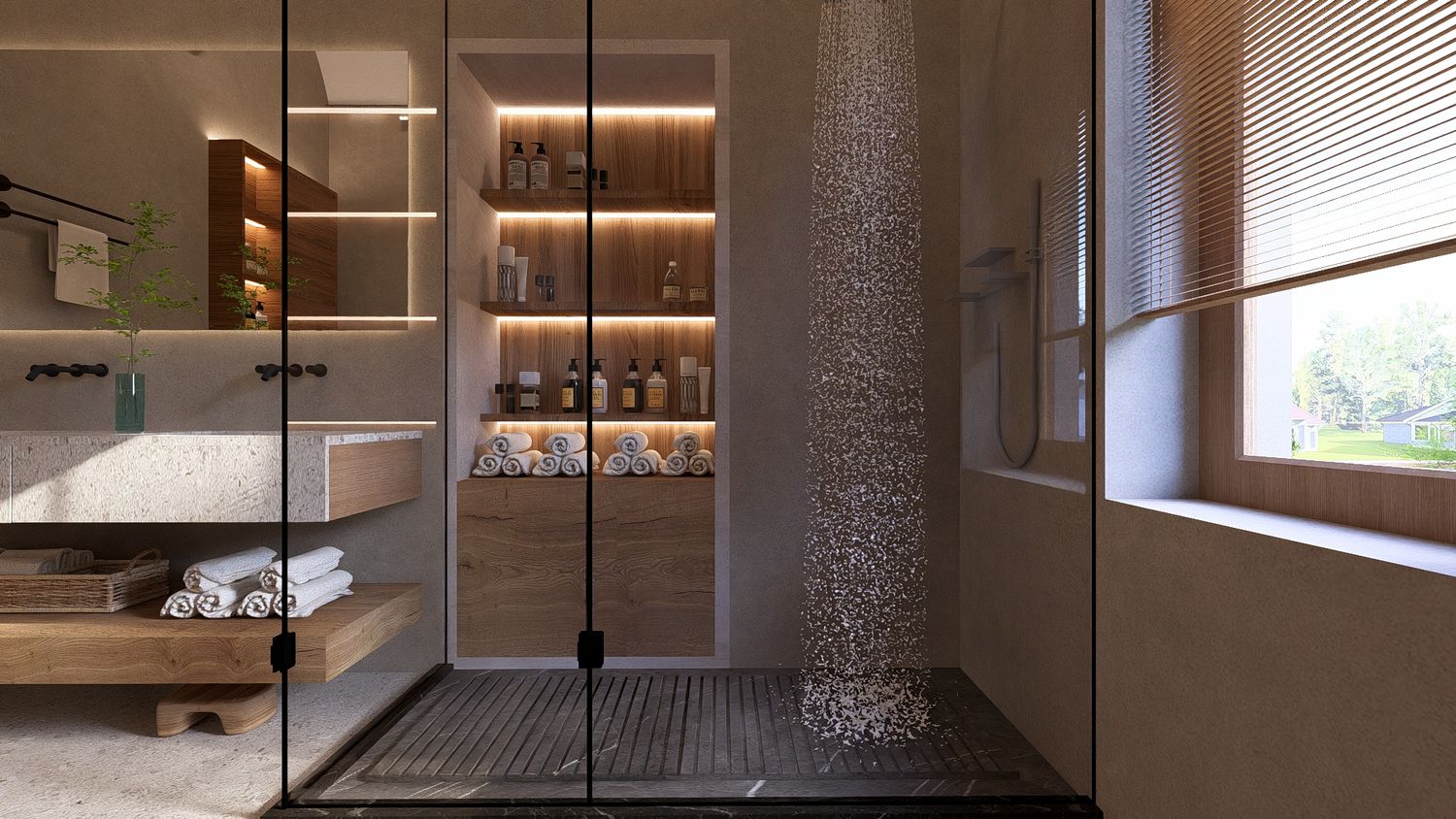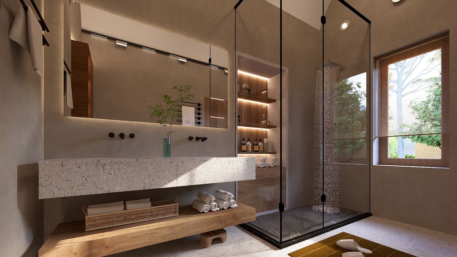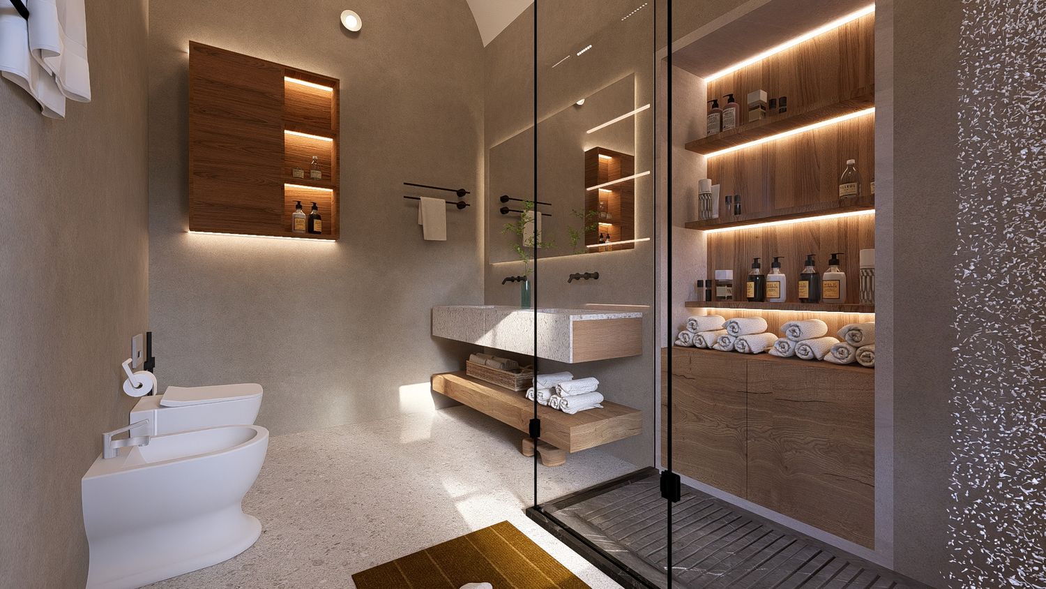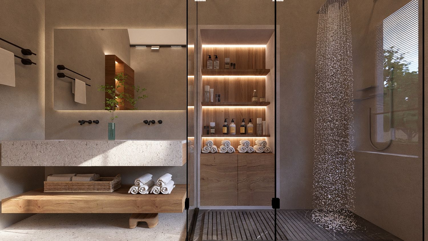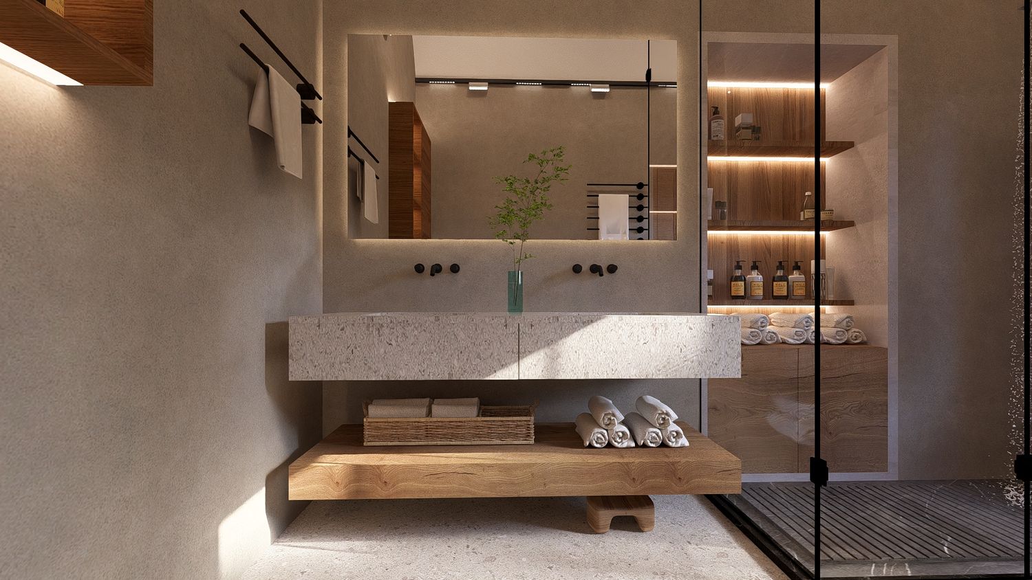 Lo stile minimalista di ispirazione orientale si esprime attraverso superfici continue in microcemento/pietra, che creano un ambiente materico, caldo e rilassante, privo di interruzioni visive.