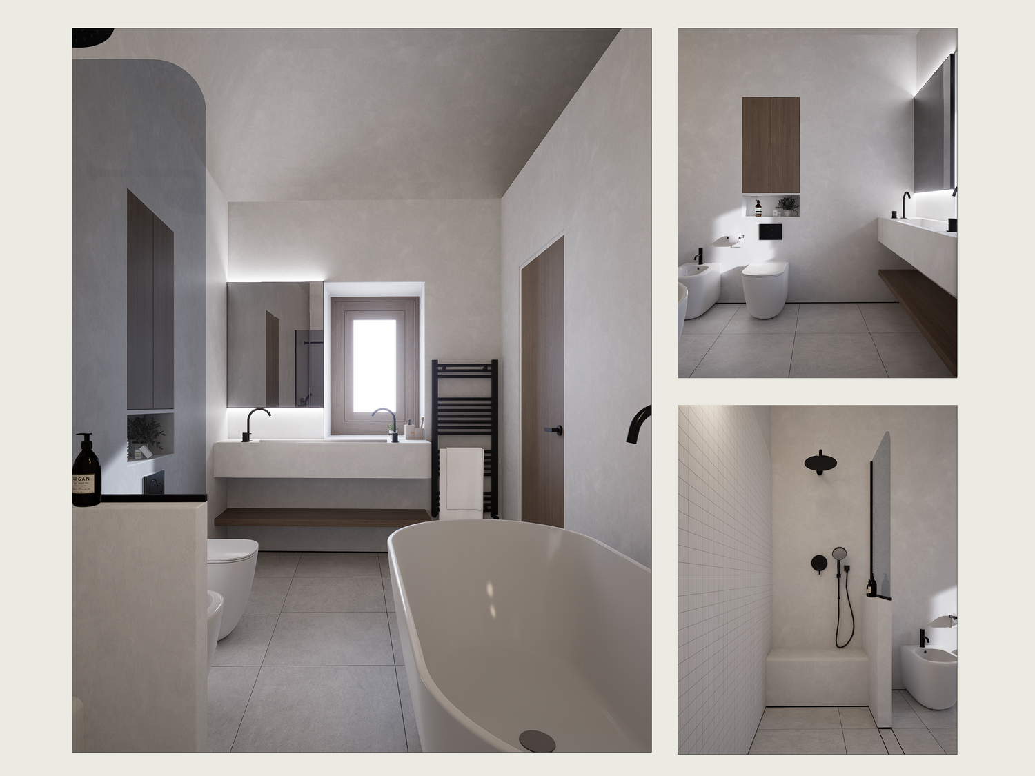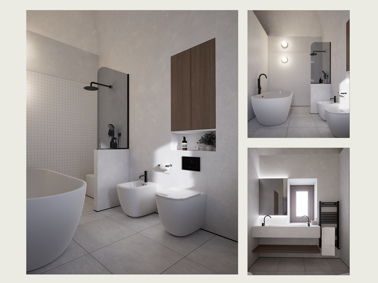 I propose a design inspired by the wabi-sabi philosophy of the Orient. The design incorporates a bathtub and shower with a seating area beneath the shower. The bidet and toilet are placed against the wall in a recess, which is utilised for storage and covered. The washbasin is positioned beside the window to maximise natural light and facilitate drying of the area beneath the washbasin. The radiator heater is replaced with a room dryer and towel dryer.