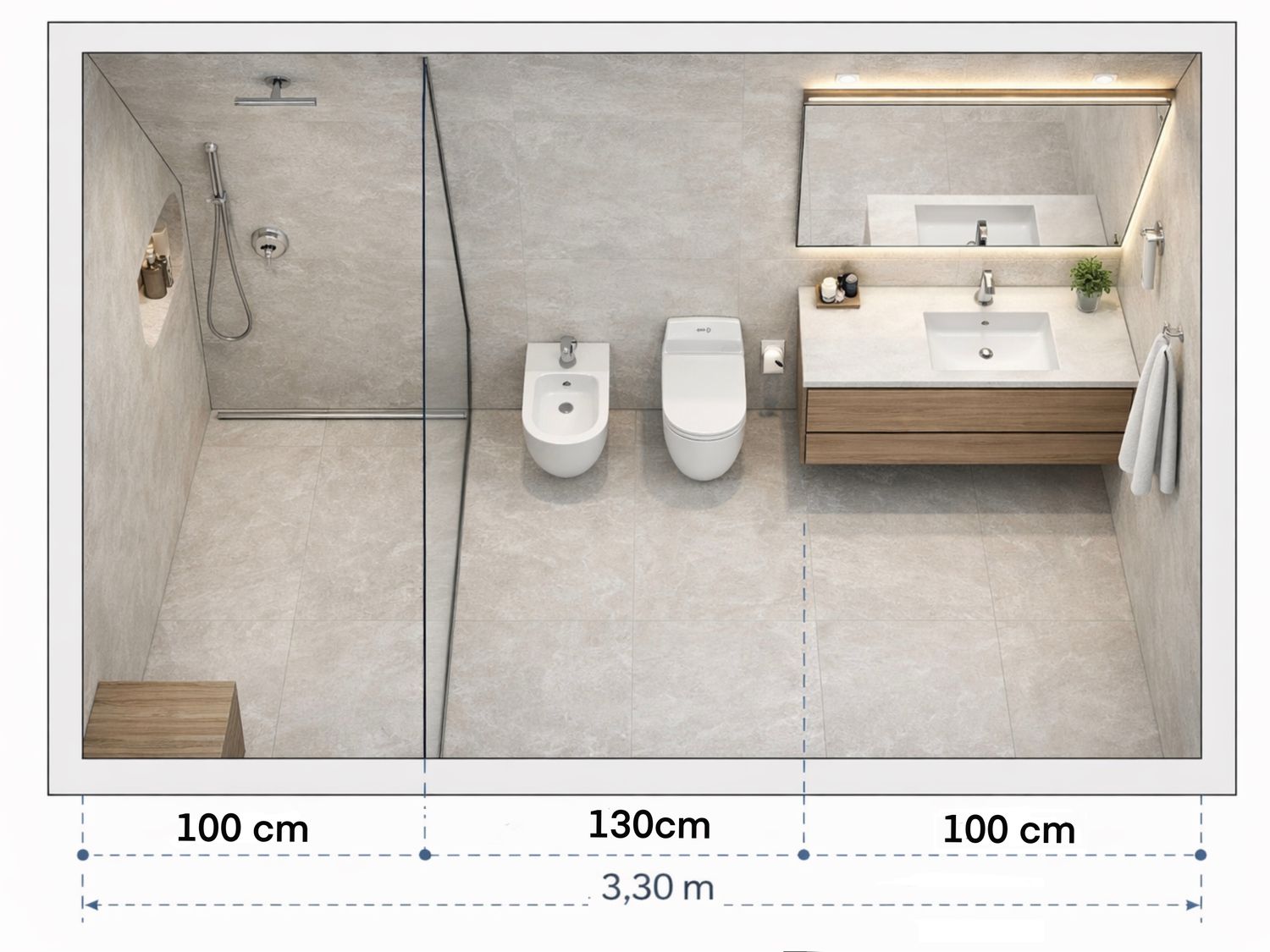• Relocation: The toilet and bidet have been moved to a new, optimized position.