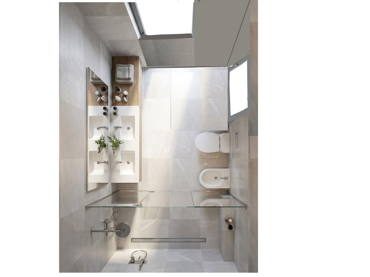 • Relocation: The toilet and bidet are placed adjacent to the door for improved flow.