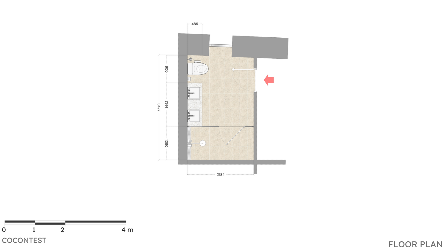 The double basin is positioned in the middle, between toilet and walk-in shower. Best,