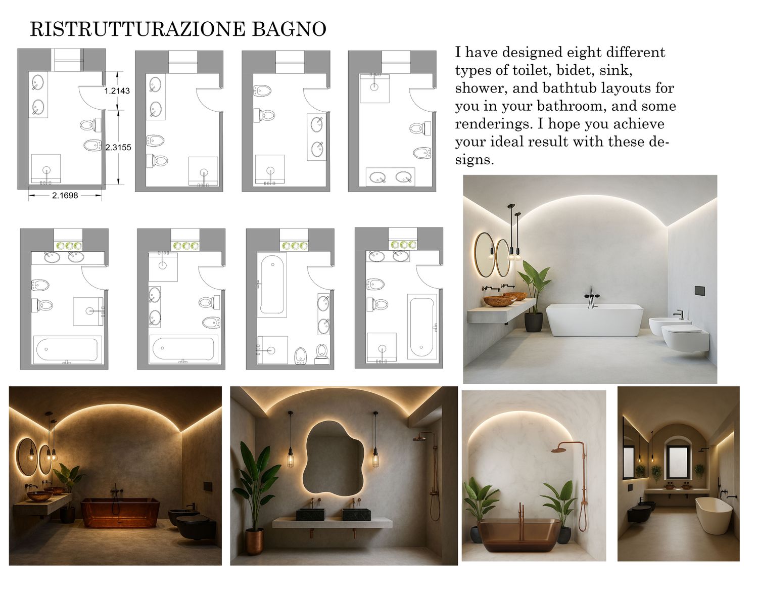 I have designed eight different types of toilet, bidet, sink, shower, and bathtub layouts for you in your bathroom, and some renderings. I hope you achieve your ideal result with these designs.
