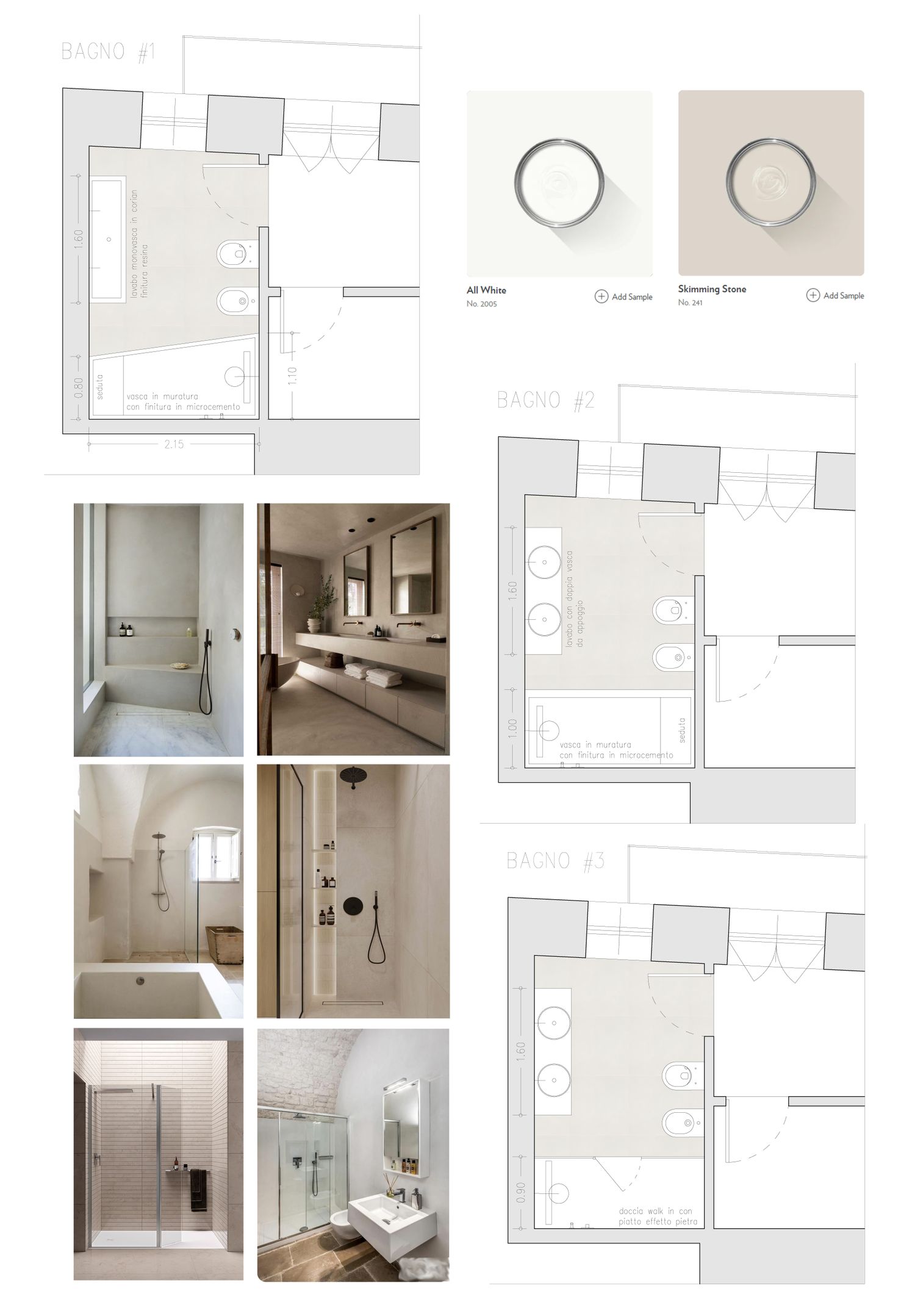 Tre proposte di arredo per il bagno, con finiture in gres effetto pietra, intonaco bianco e/o microcemento finitura resina, per un mood minimale/japandi con rimandi alla tradizione rurale italiana.