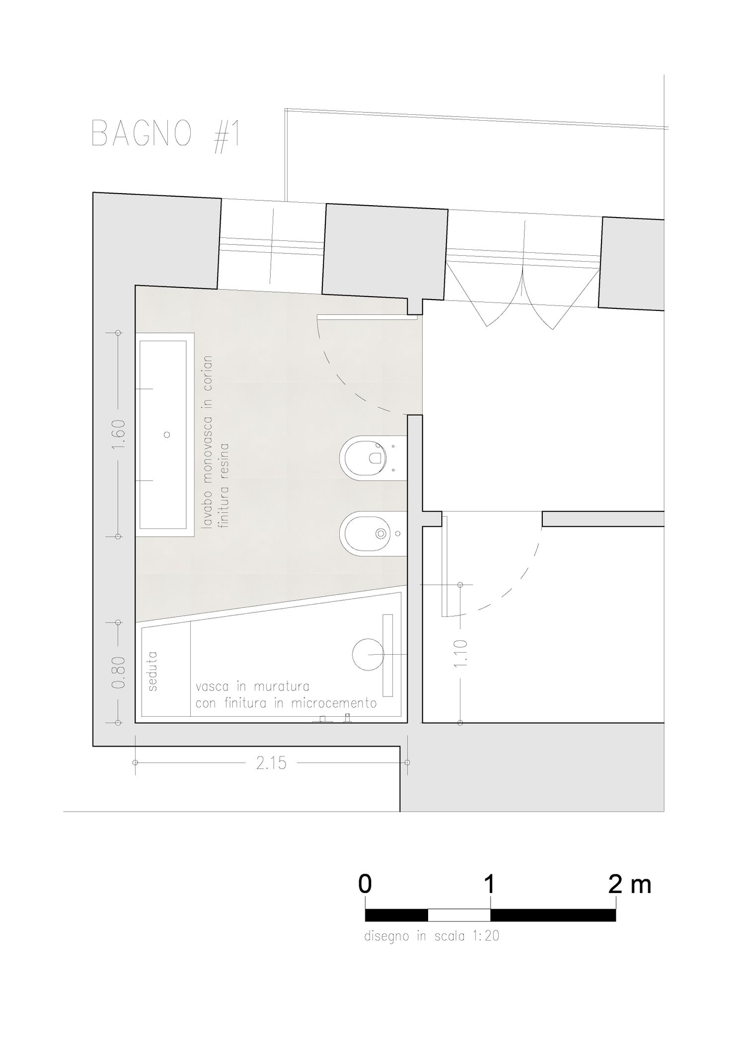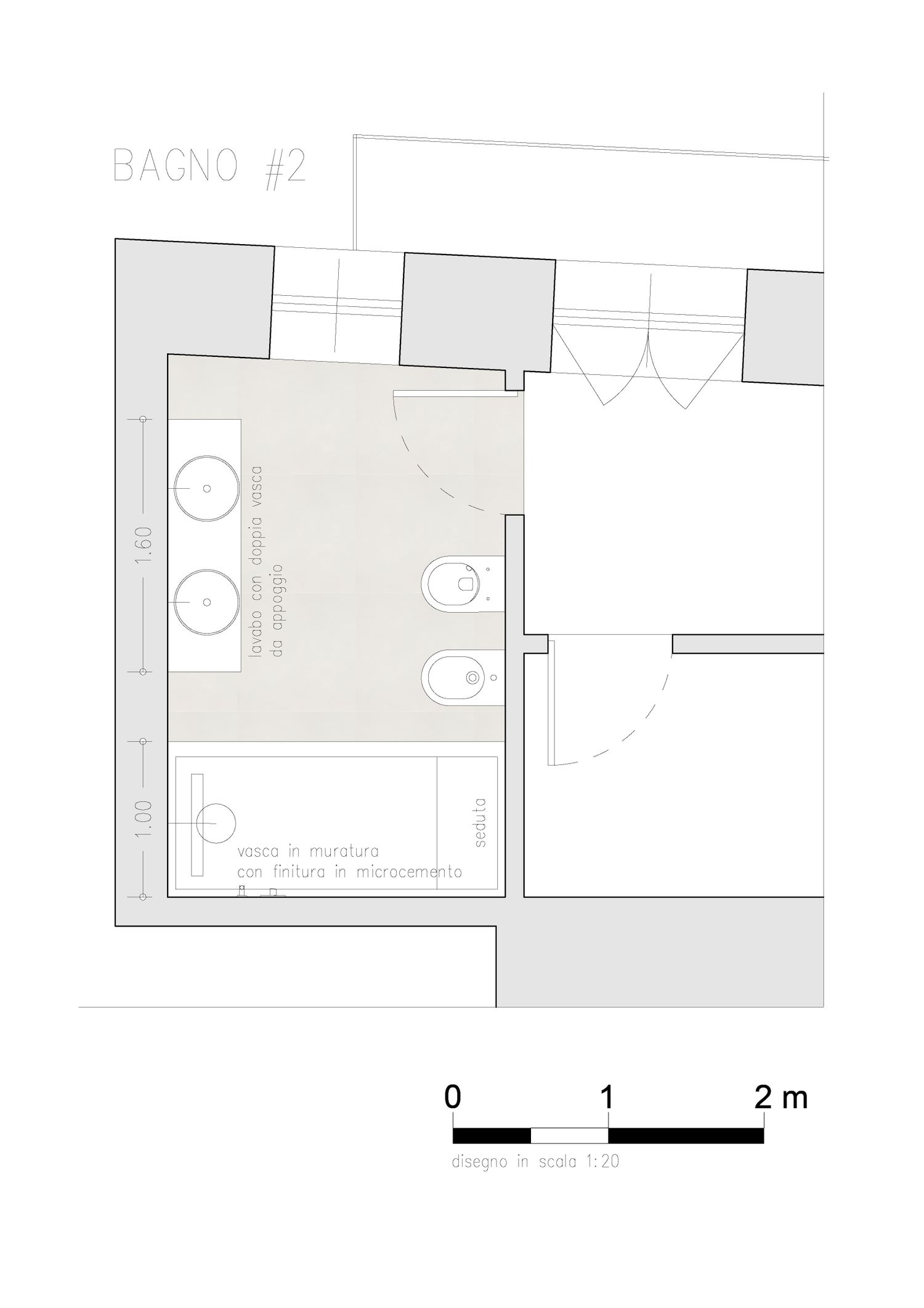 La volta viene mantenuta a vista e valorizzata, la nicchia laterale chiusa. Tra le variabili d'arredo, proponiamo una vasca in muratura con finitura resina, configurabile in diversi modi, oppure una doccia walk in.