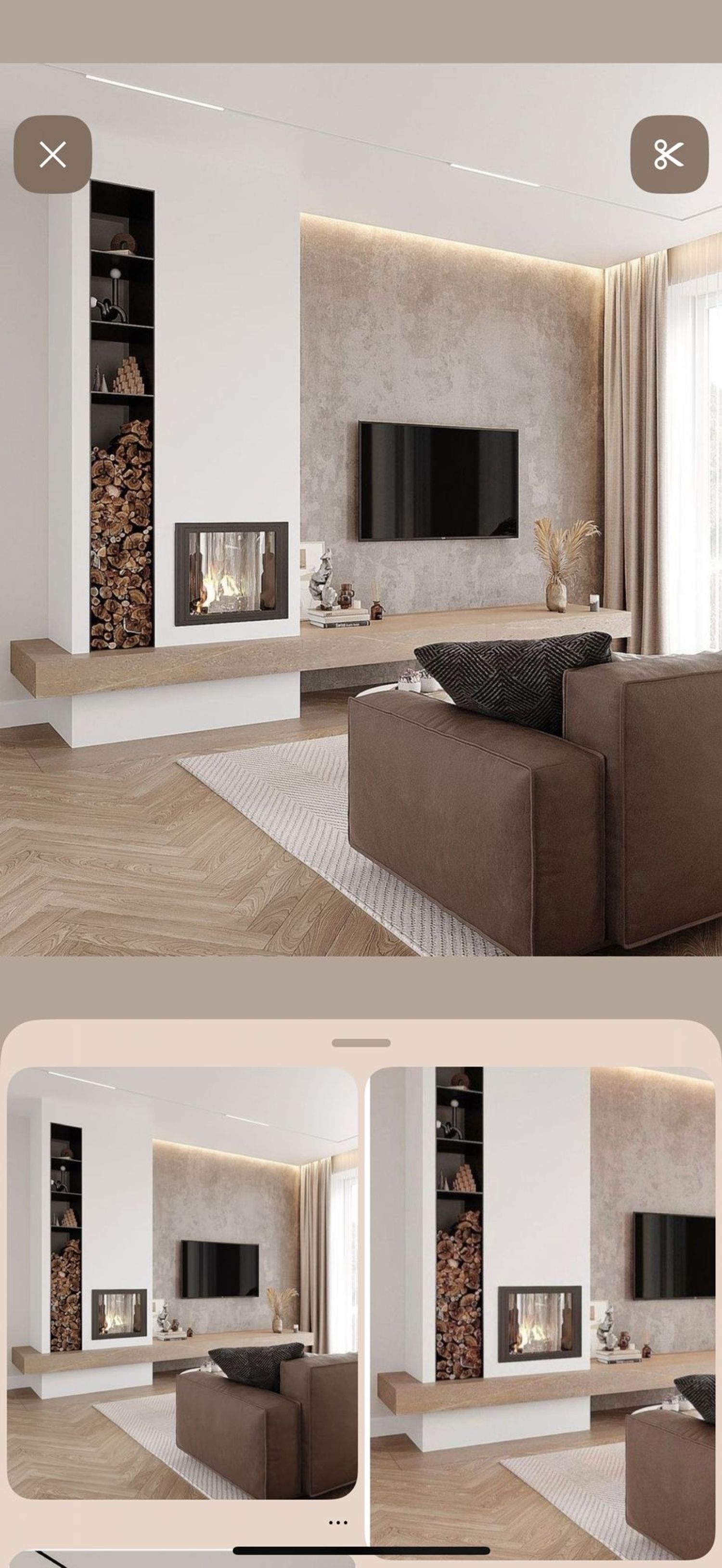 Our preferred style is modern contemporary, with beige/wood tones combined with marble effects. We would also like a modern fireplace in the living room, possibly with a stone-effect wall behind the TV.