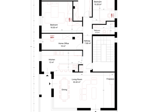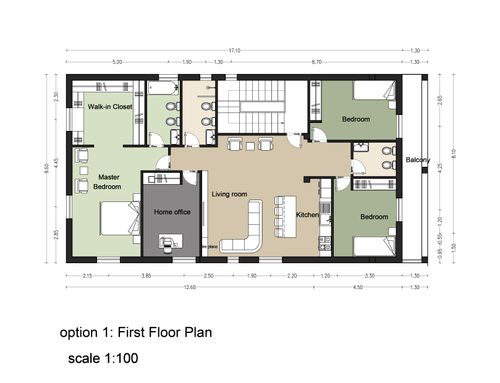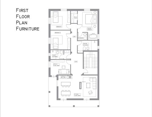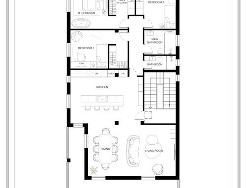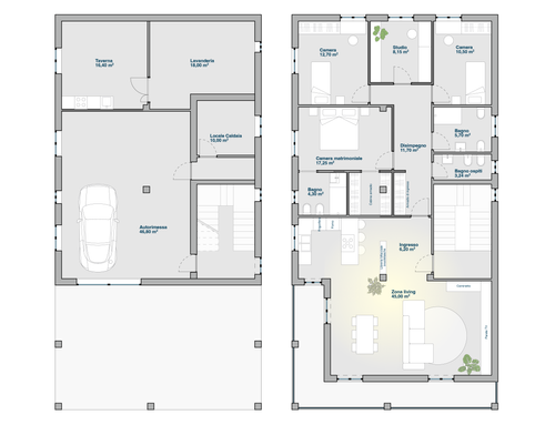 On the first floor, we would like to have an entrance with an open space living room and kitchen (with an island or a peninsula), a master bedroom with a nice walk-in closet and, if possible, depending on the measurements, a bathroom or bathtub inside the bedroom. We would also like 2 kids’ bedrooms, a main bathroom and a small service bathroom, both with a shower. If space allows, we’d also like to include a home office.