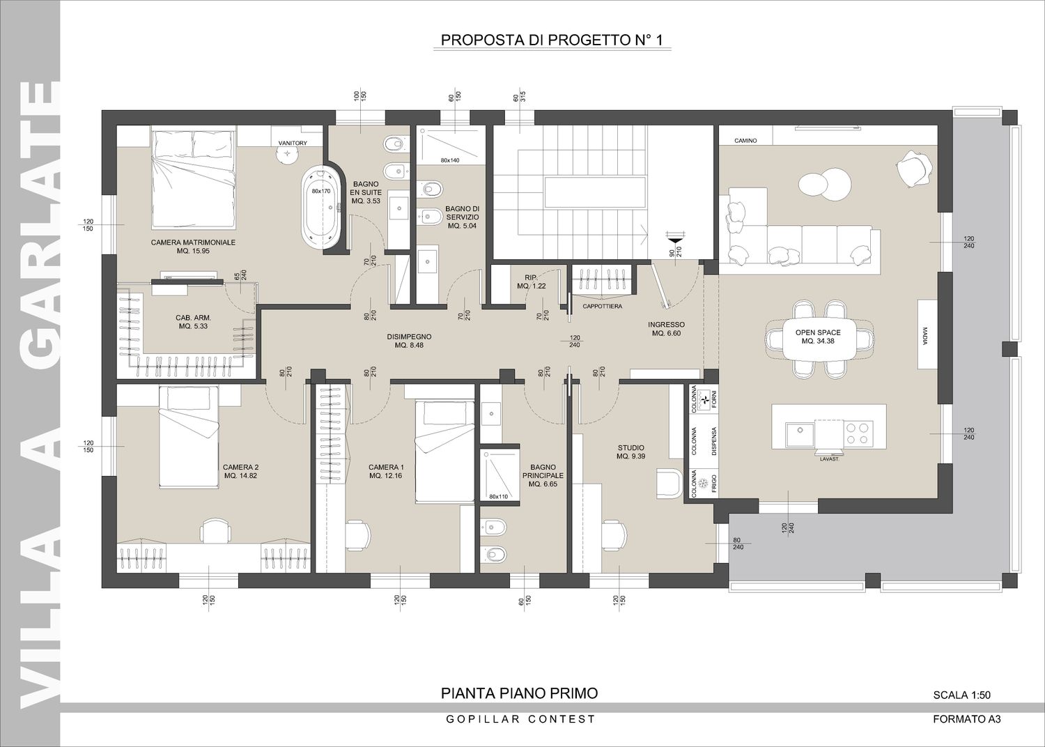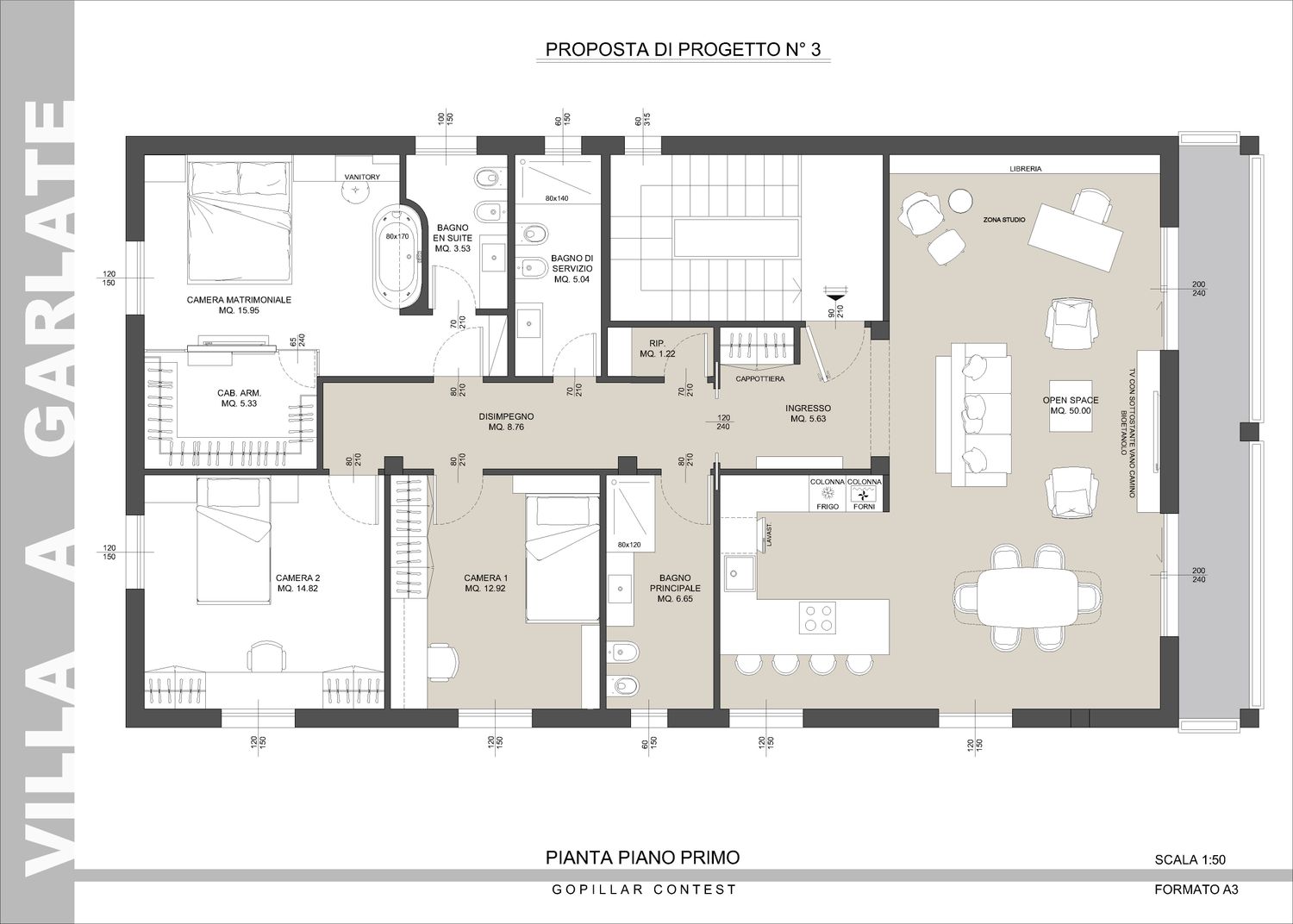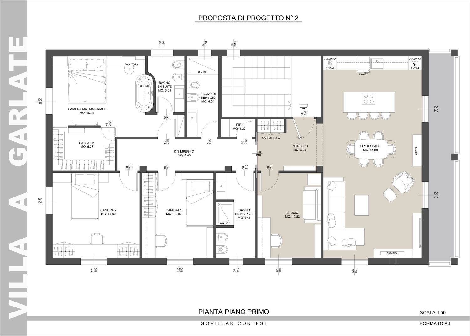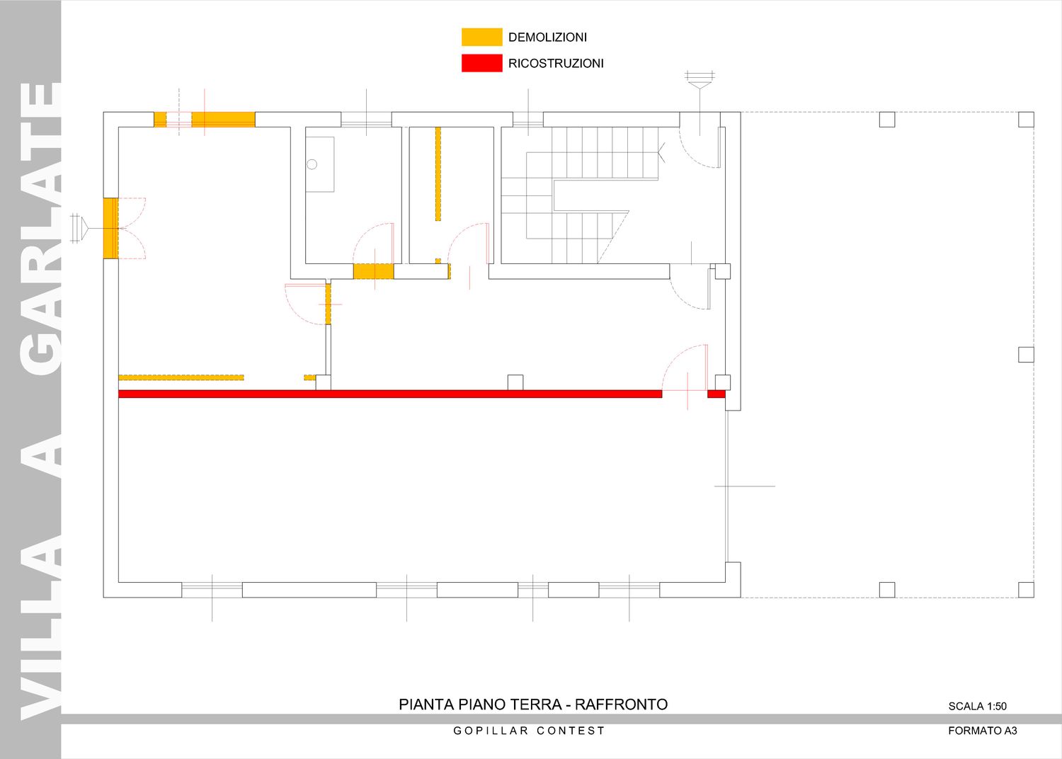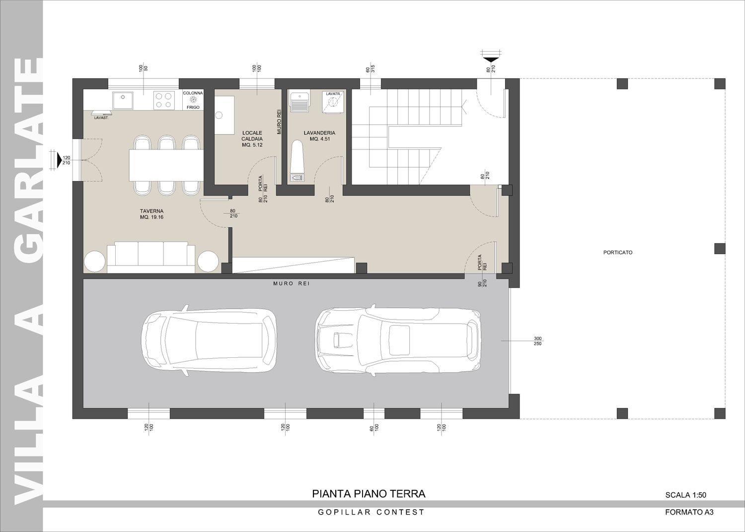 Al piano terra è inoltre definito con maggiore precisione lo spazio destinato al parcheggio delle auto, delimitato da un muro REI conforme alla normativa antincendio, nonché i locali tecnici: caldaia, lavanderia e un ambiente da adibire a taverna con accesso diretto al giardino.