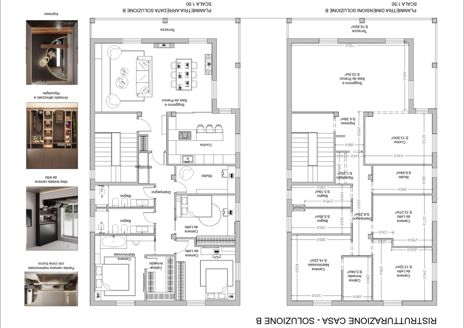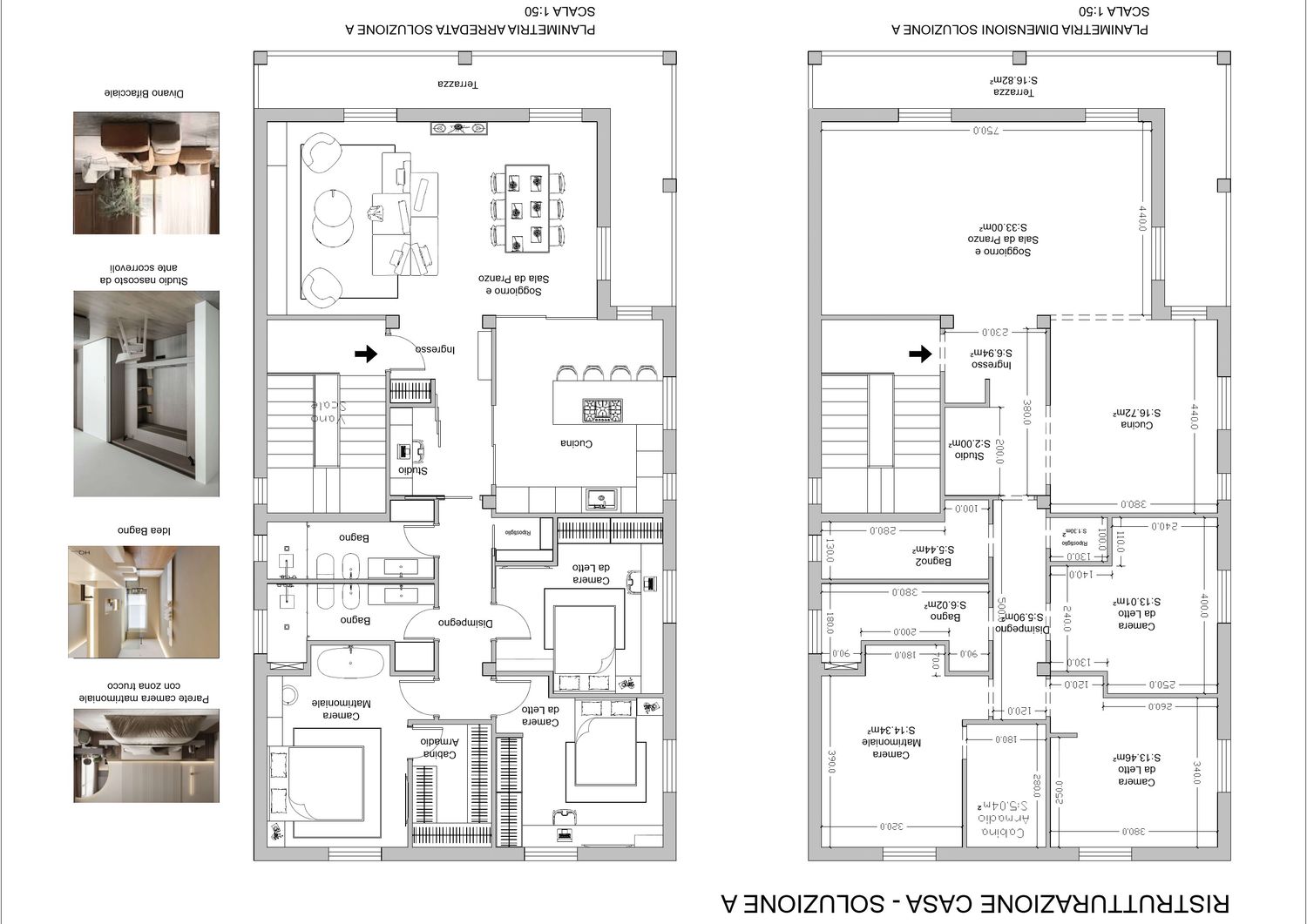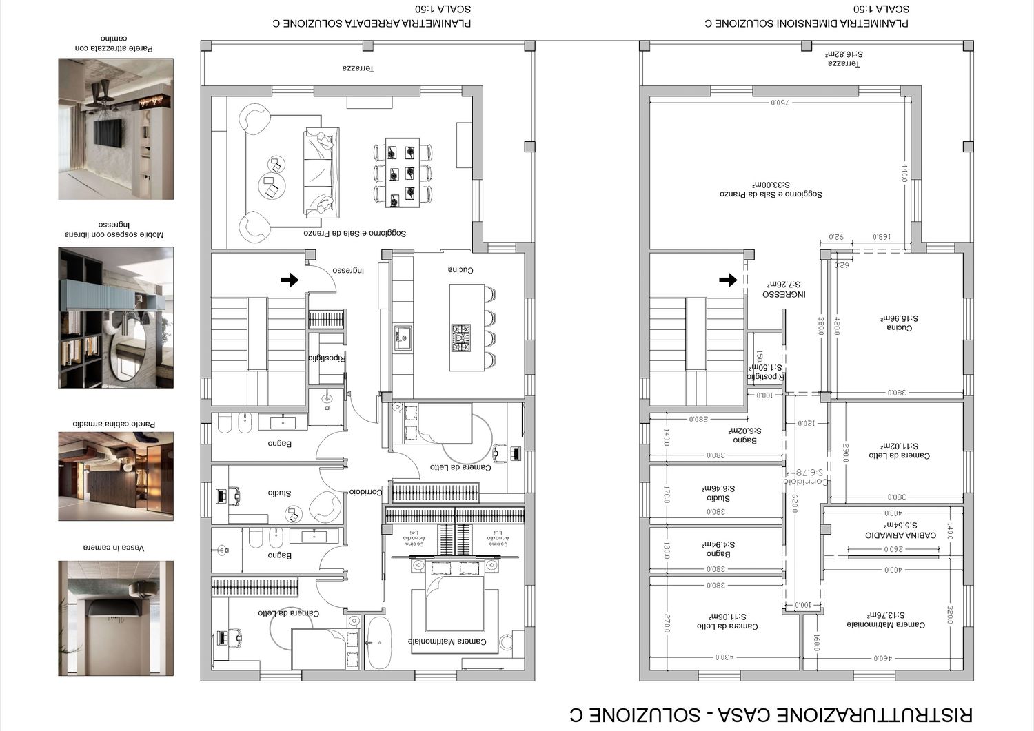 in base alle Sue richieste ho sviluppato tre proposte progettuali, ognuna delle quali risponde alle Sue esigenze dando priorità, di volta in volta, a specifici aspetti funzionali e distributivi.