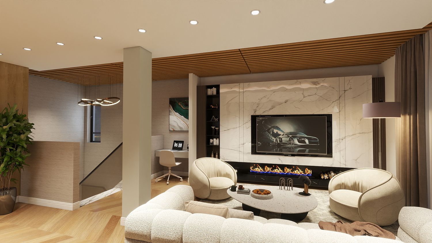 Camino moderno nella zona living, con parete TV effetto pietra come elemento scenografico centrale.