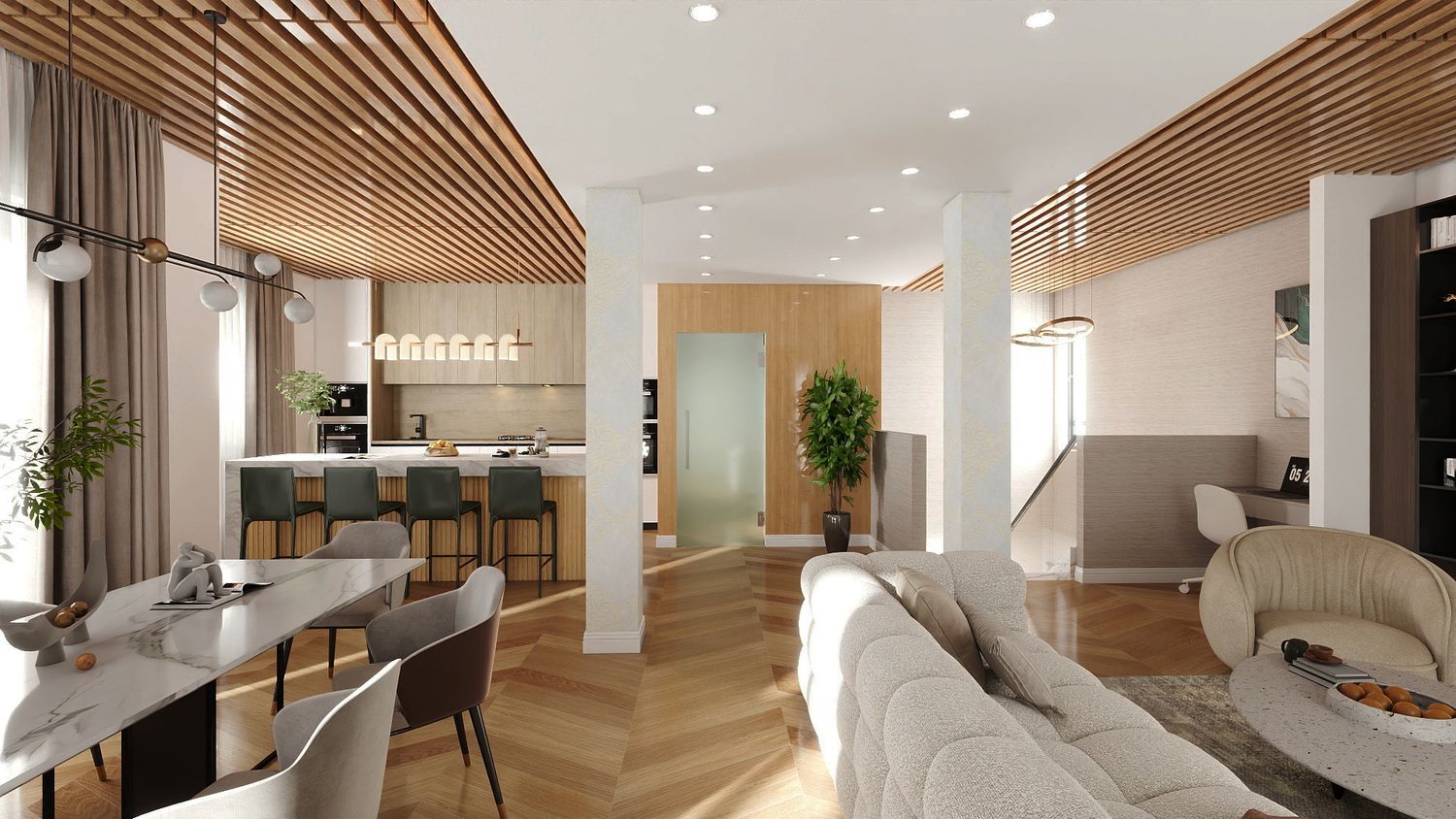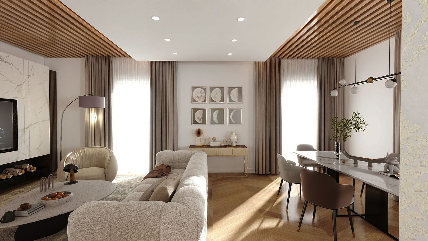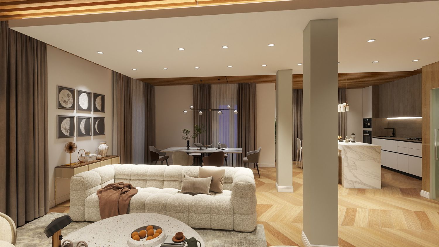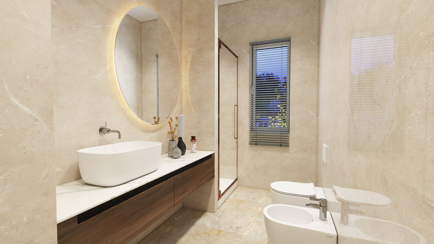 Il design proposto si ispira a un linguaggio moderno–contemporaneo, con tonalità calde di beige, legno naturale e accenti effetto marmo, per creare un ambiente accogliente e luminoso.