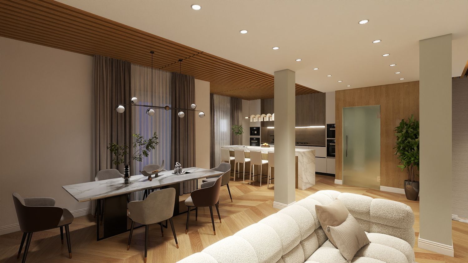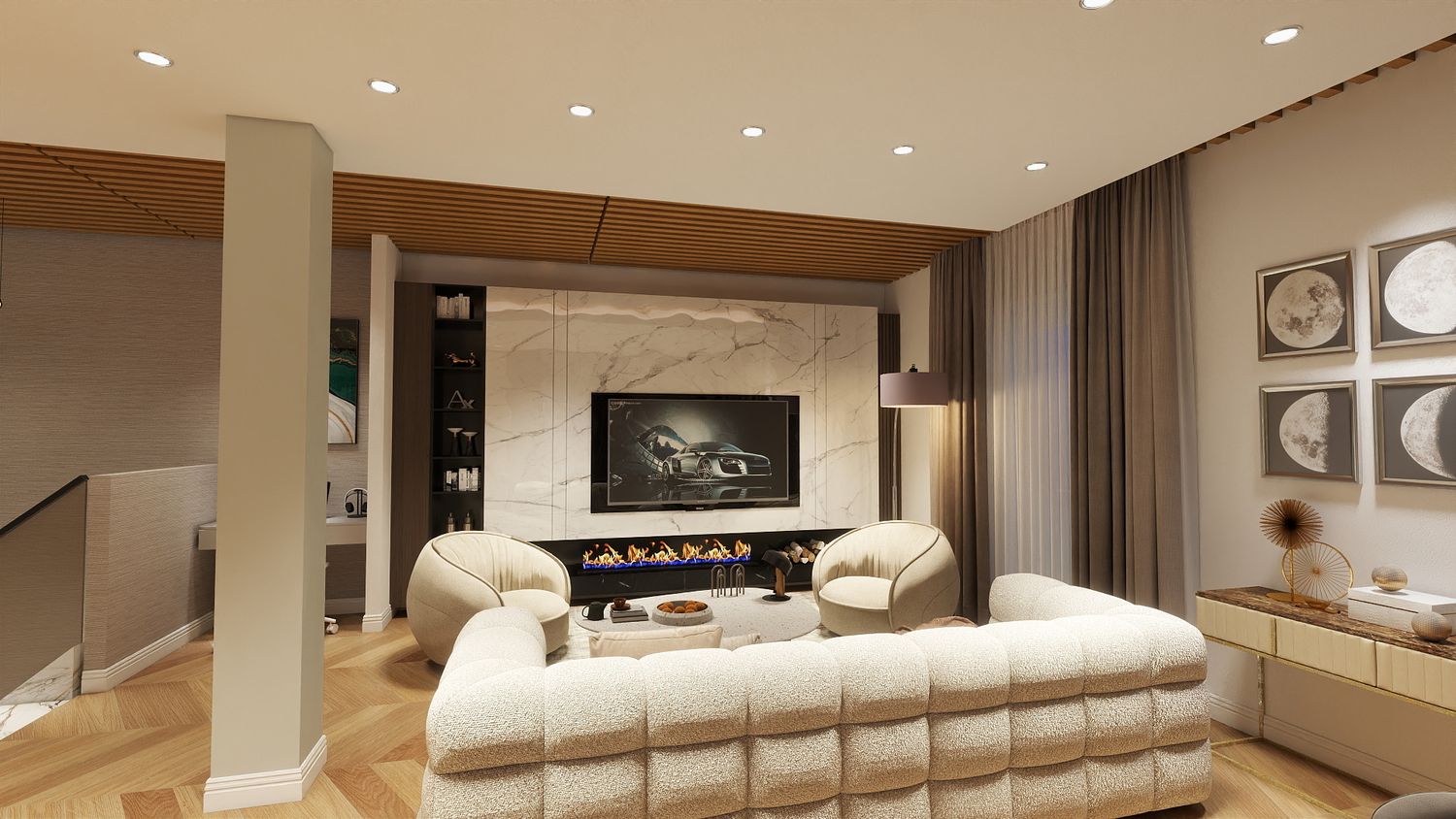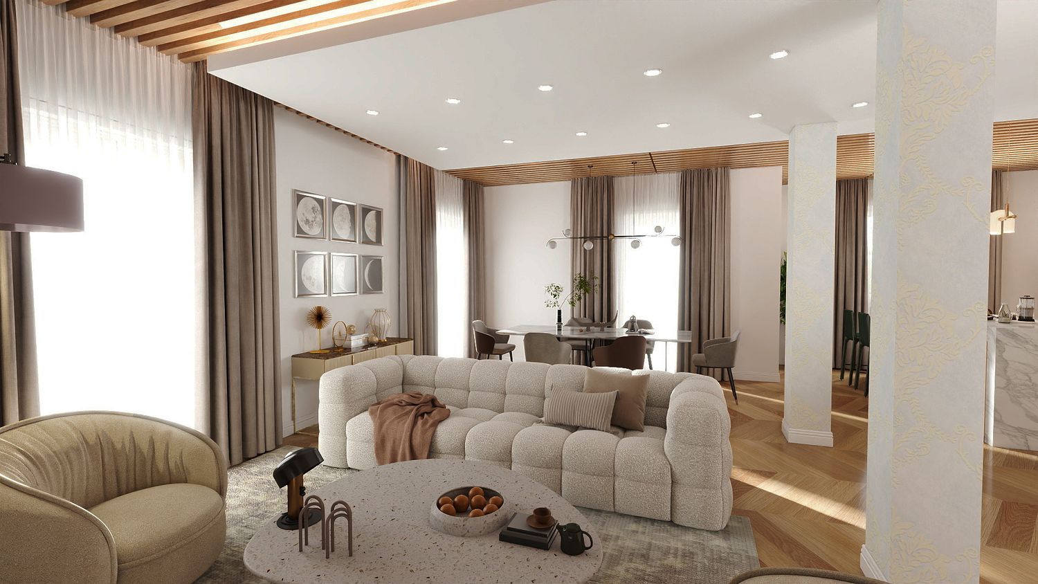 Il design proposto si ispira a un linguaggio moderno–contemporaneo, con tonalità calde di beige, legno naturale e accenti effetto marmo, per creare un ambiente accogliente e luminoso.