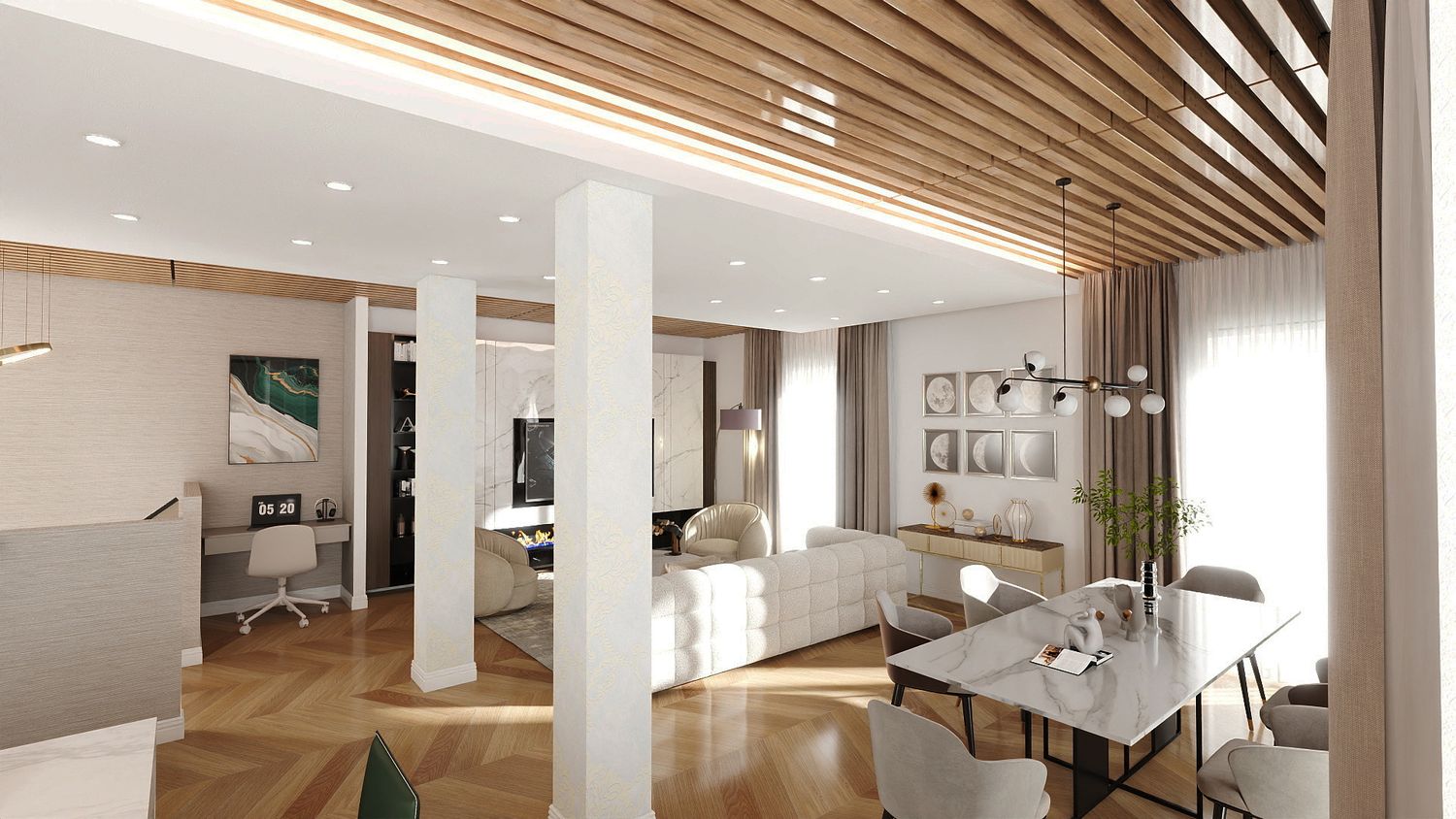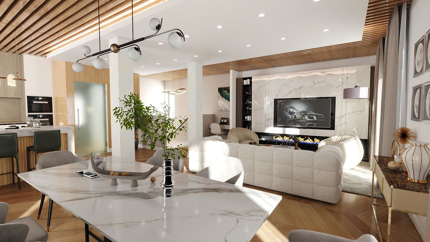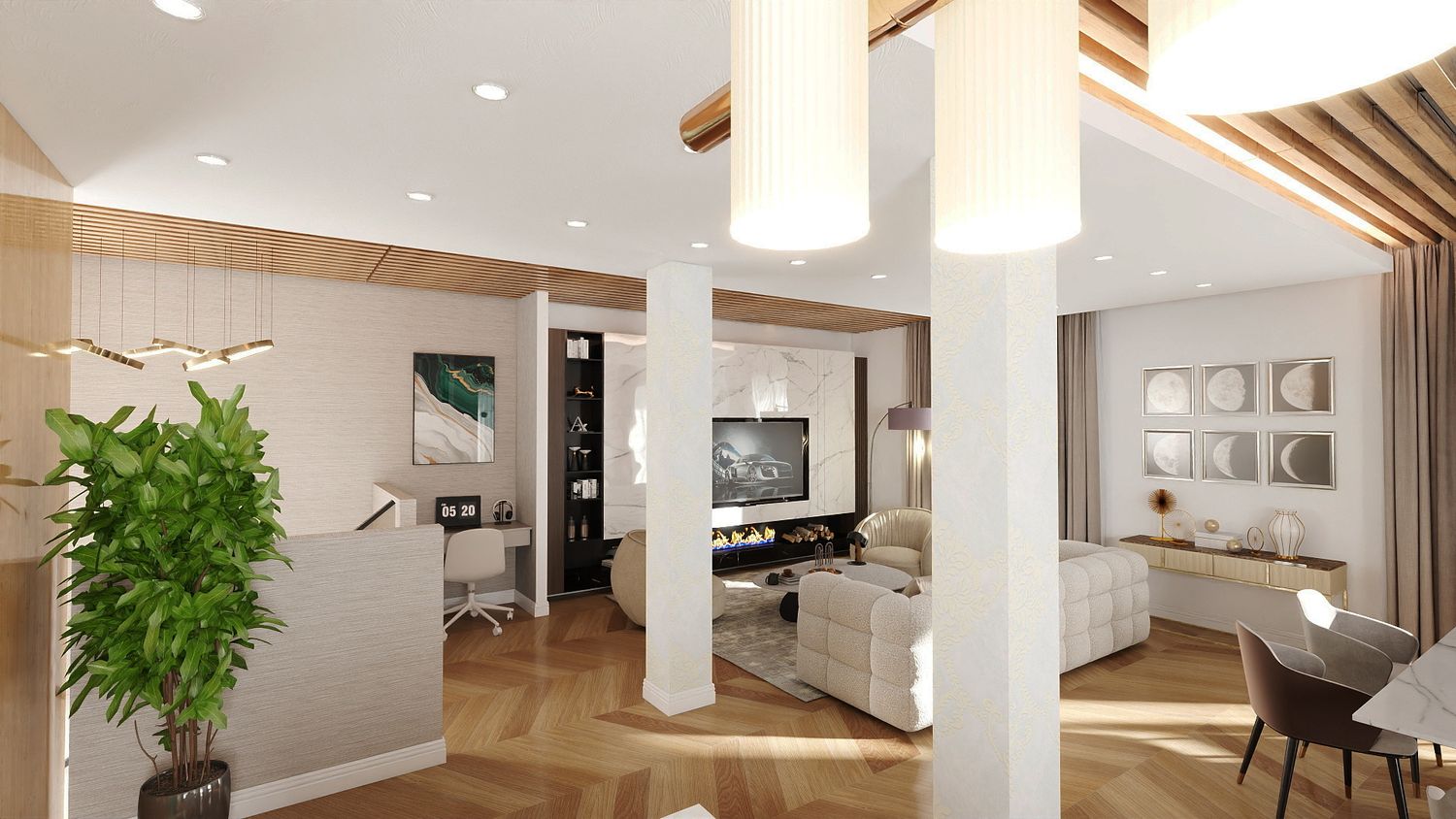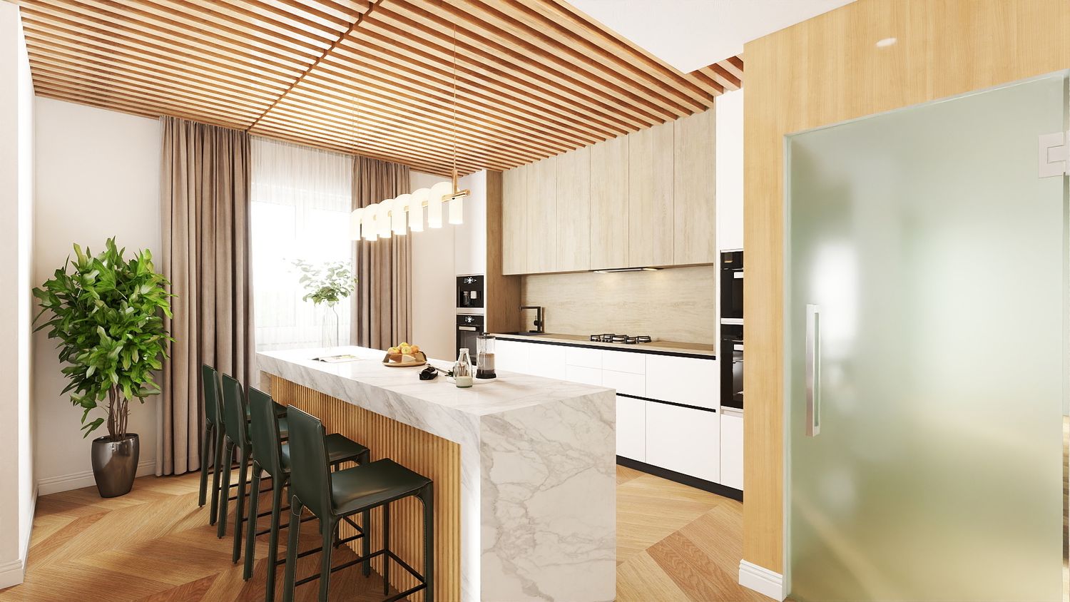 Il design proposto si ispira a un linguaggio moderno–contemporaneo, con tonalità calde di beige, legno naturale e accenti effetto marmo, per creare un ambiente accogliente e luminoso.