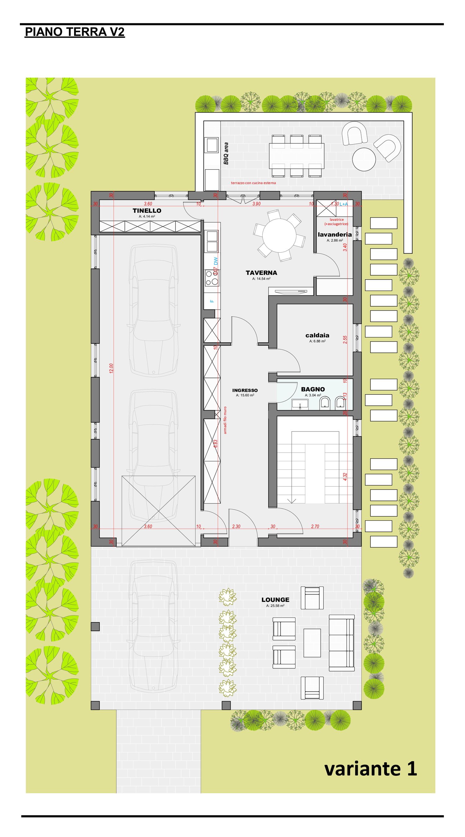 A causa delle dimensioni contenute, non è stato possibile inserire un box doppio parallelo; per questo motivo sono state sviluppate due varianti di piano terra, che rispondono in modo diverso alle esigenze funzionali e spaziali.