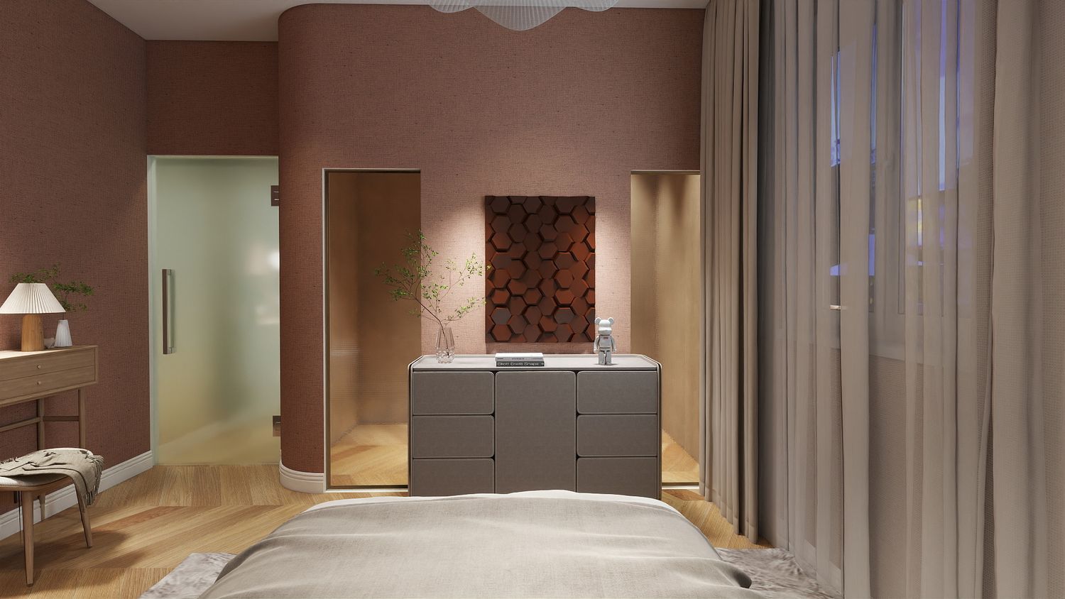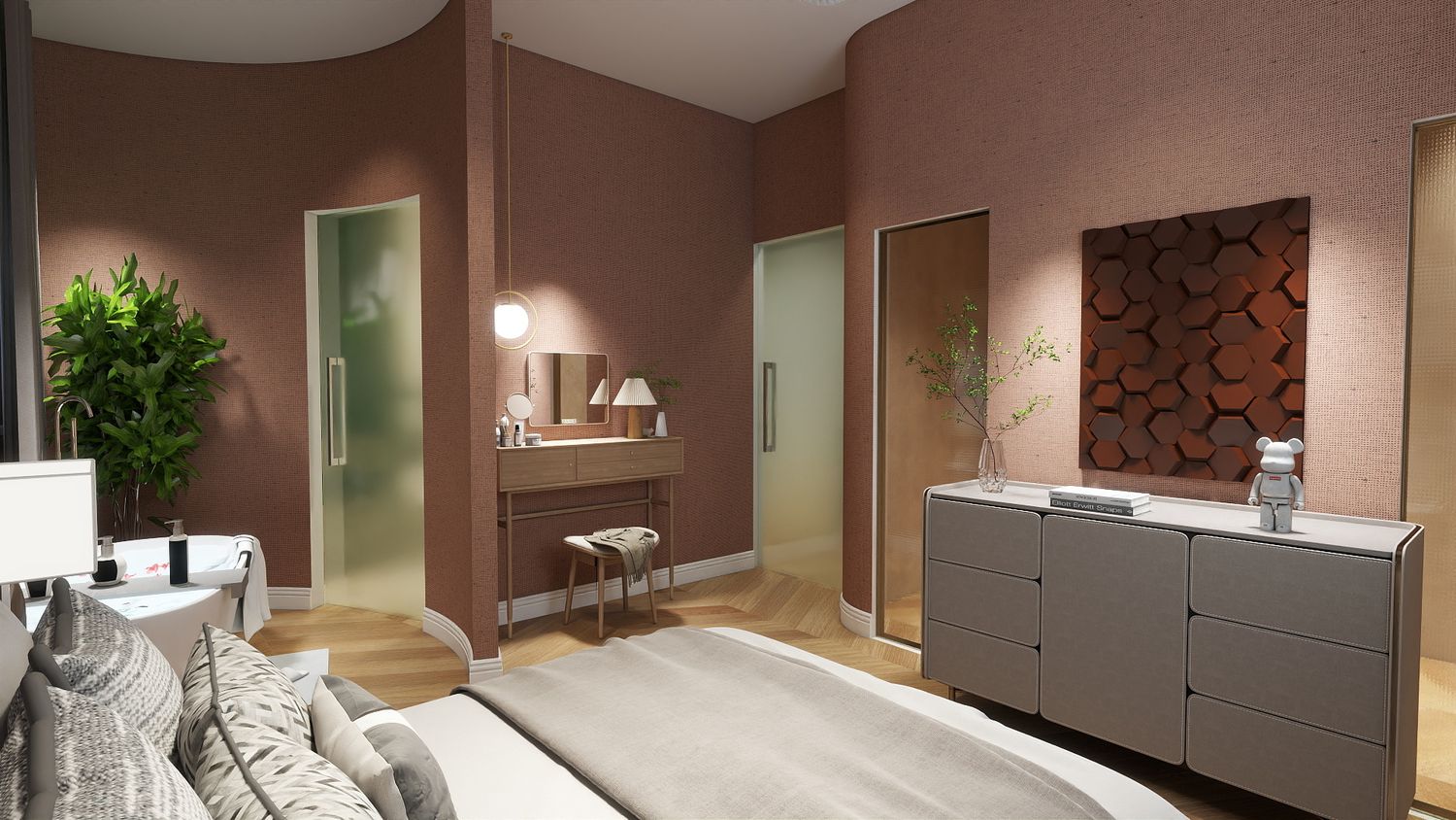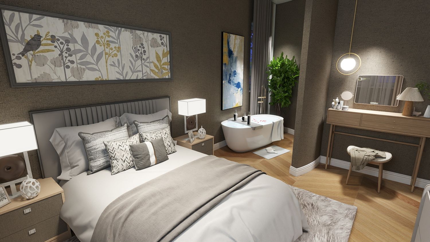 Vasca da bagno integrata nella camera matrimoniale, come elemento di comfort e design.