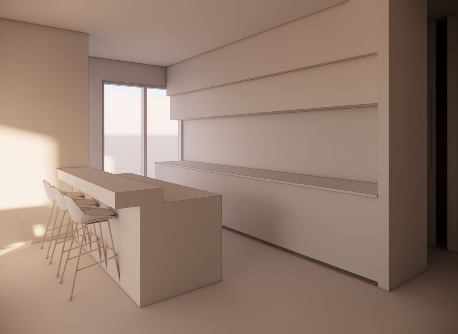 The kitchen and the bar are placed along the corridor to minimize wasted space and allow for full use of all areas.