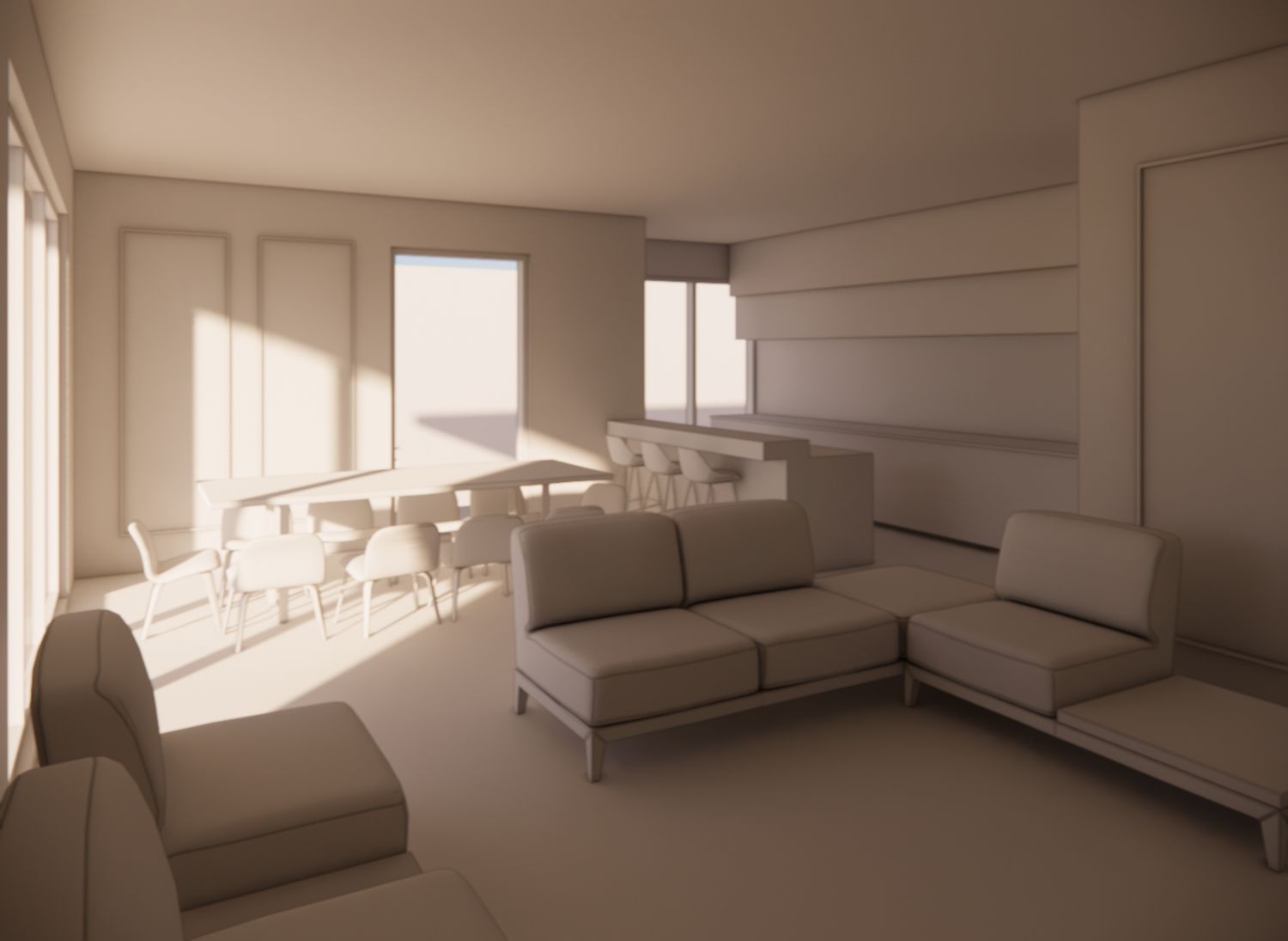 I haven’t placed anything on the kitchen island for now, but you can choose to have either the stove or the sink there. I also added a dining section on the island, which is distinguished from the main kitchen counter by a difference in height.