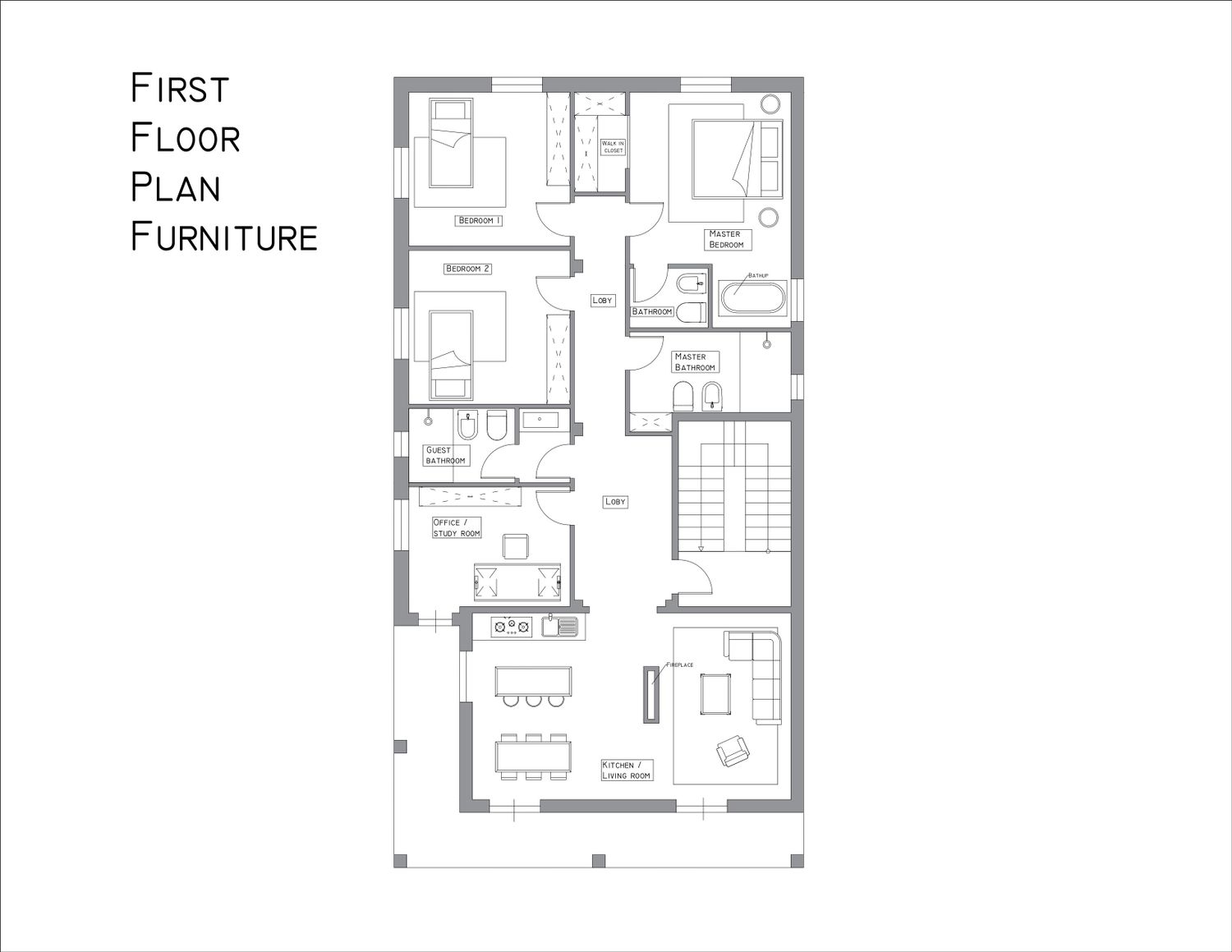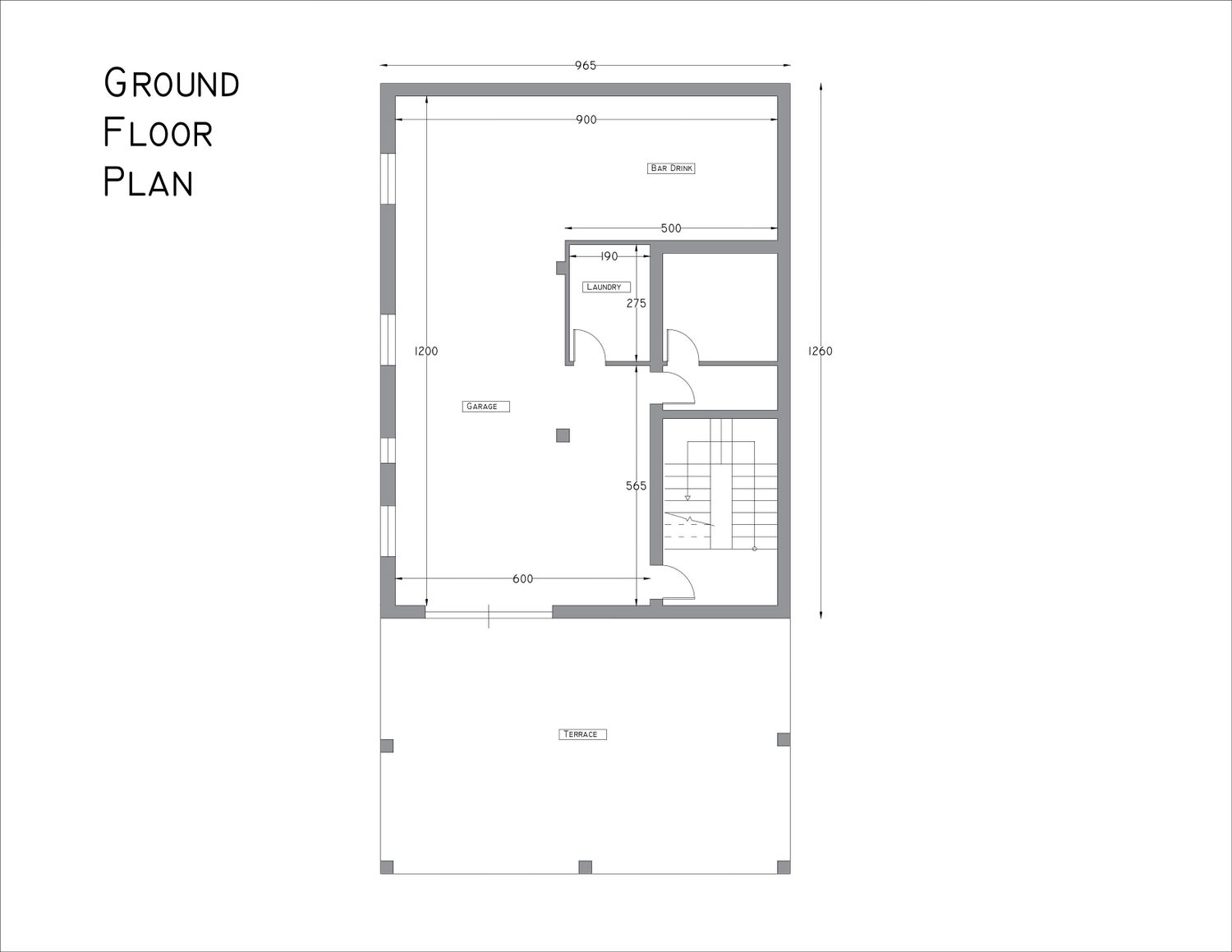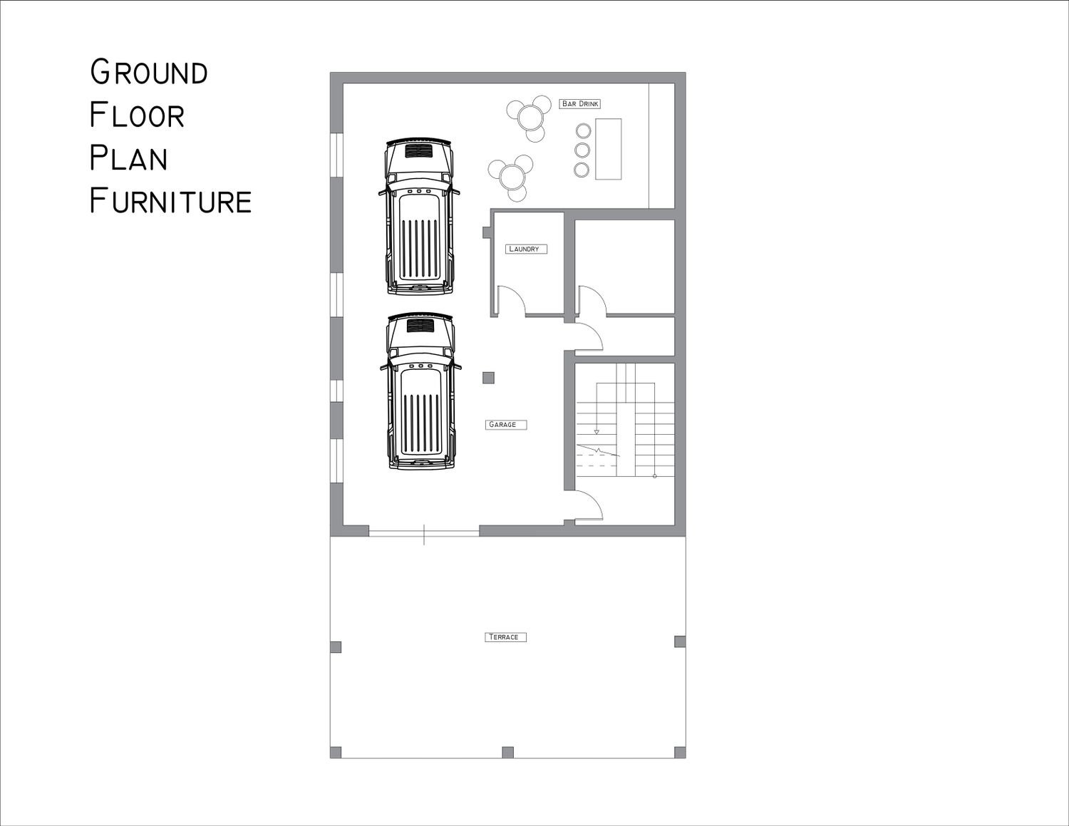 I attempted to create a ground floor with a double garage by removing the laundry area and creating space for a beverage shop. On the first floor, you can see I attempted to create an efficient design by knocking down several walls and adding several more.