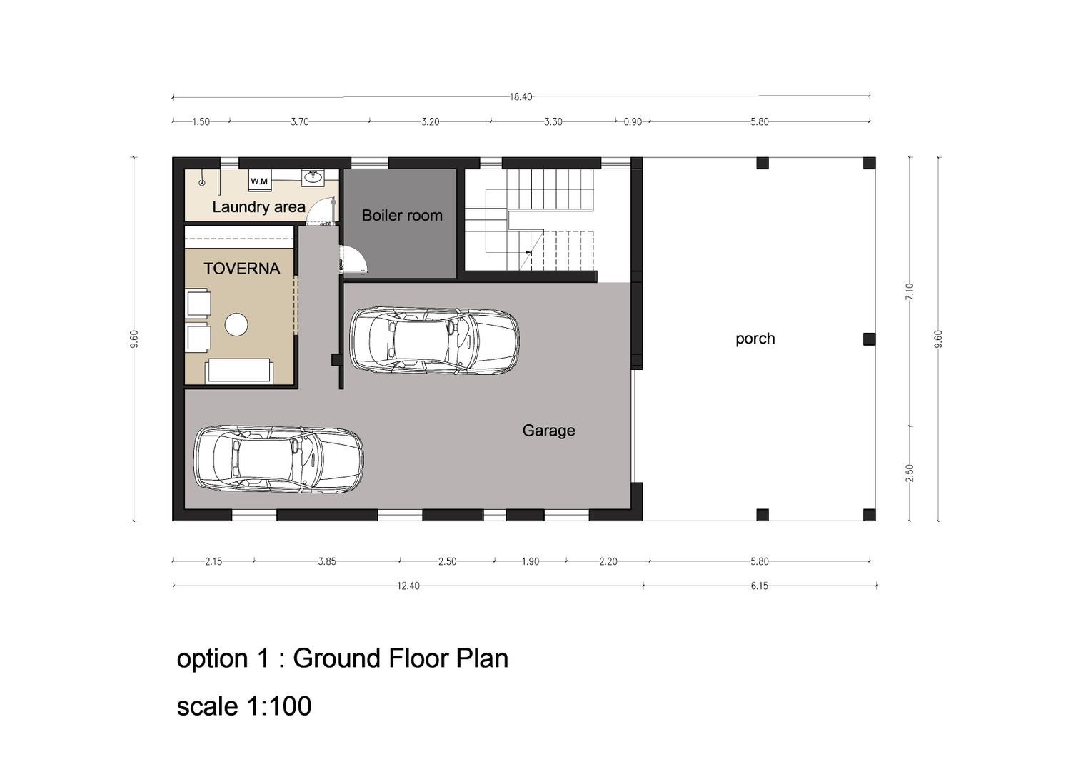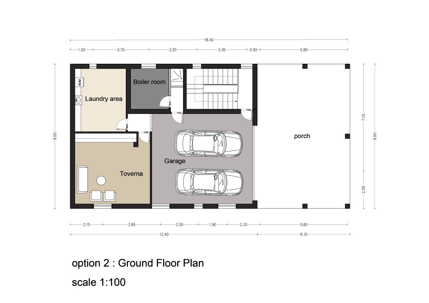 On the ground floor, the layout has been reconfigured to include a double garage designed for two vehicles, with a TOVERNA located at the rear, as requested by the client. The existing laundry and mechanical room have been retained to ensure operational efficiency and continuity of building services.