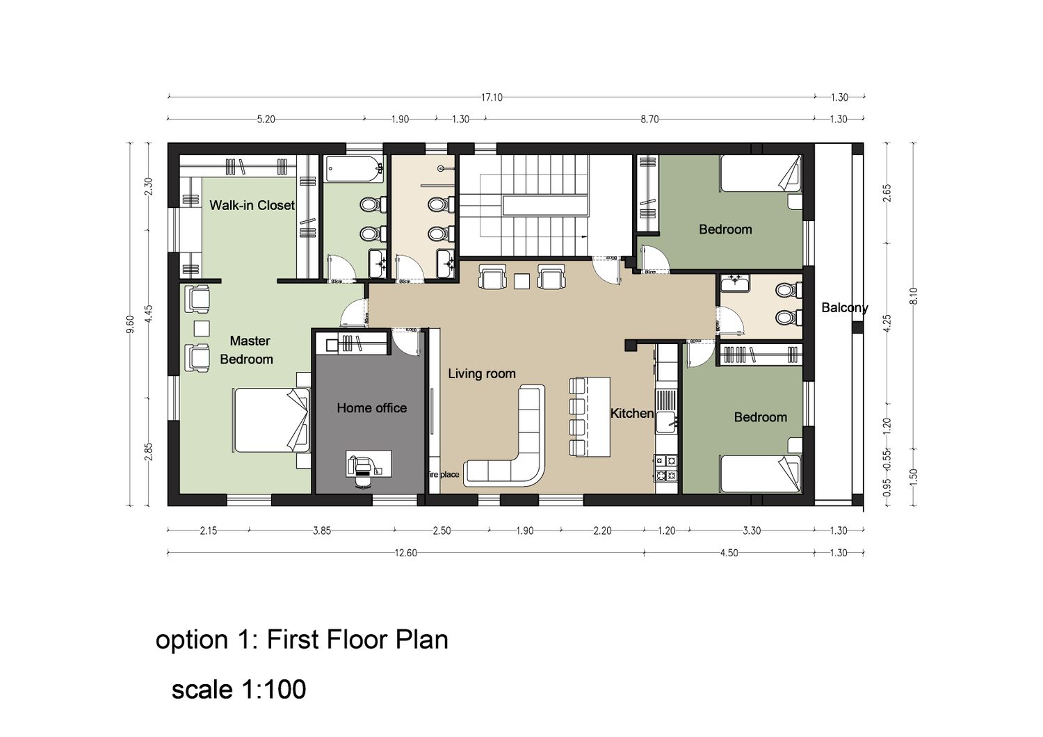 Option 1 emphasizes privacy and zoning by placing the master suite and home office in a dedicated private wing, fully separated from the children’s bedrooms.