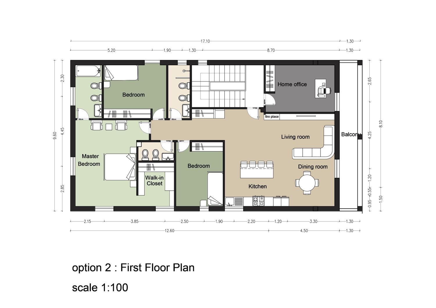Option 2 prioritizes a more generous shared living environment, incorporating a defined dining area. In this configuration, the master bedroom and children’s rooms are located within the same wing, while the home office benefits from independent access, supporting flexible and private workspace use.