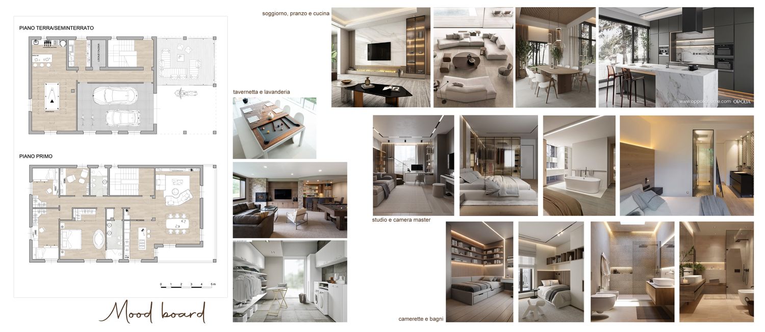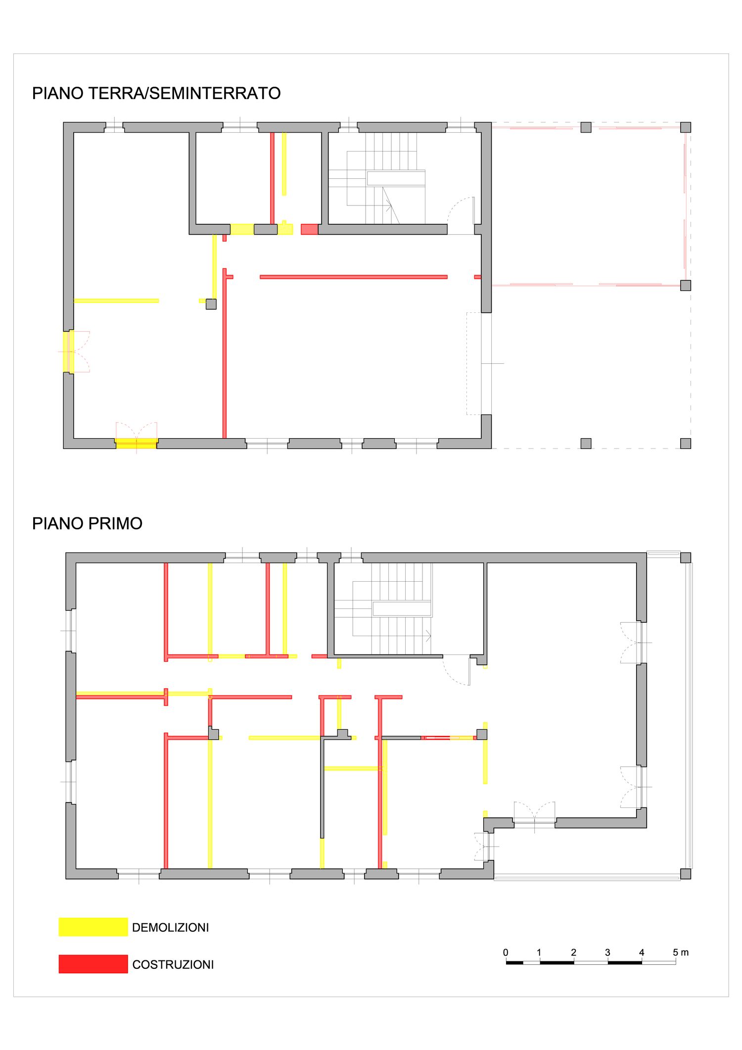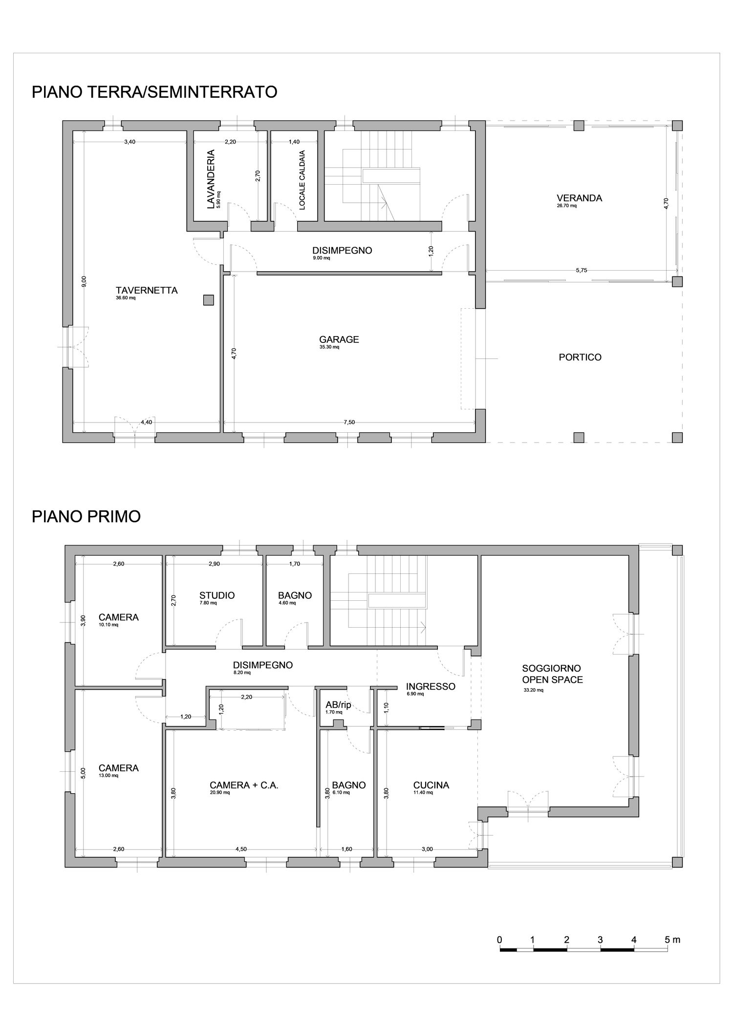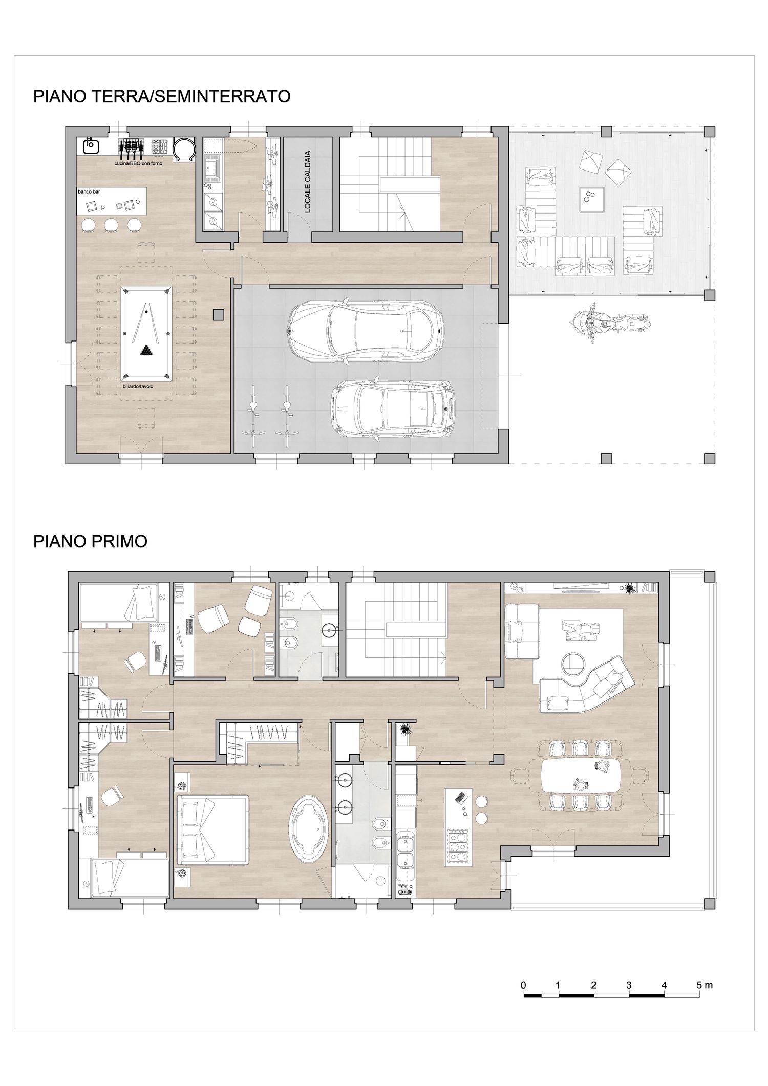 Al piano terra, vengono rimpiccioliti i vani caldaia e lavanderia, per dare ampio spazio ad una tavernetta di lusso con cucina, barbecue, piccolo forno per pizza, banco bar e tavolo trasformabile in biliardo. Il garage viene perimetrato in modo da rendere indipendente il passaggio fra i nuovi locali e il vano scala, continuando ad avere spazio a sufficienza per due auto. Il portico viene in parte chiuso da vetrate scorrevoli, in modo da creare una veranda/giardino d'inverno. Sul retro, se possibile, una finestra può essere ingrandita creando una porta finestra, e una seconda può essere creata per avere aperture verso il giardino. Per questo, abbiamo ipotizzato le due demolizioni, rimandando le altre operazioni ad uno studio di fattibilità e di progettazione dell'esterno successivi.