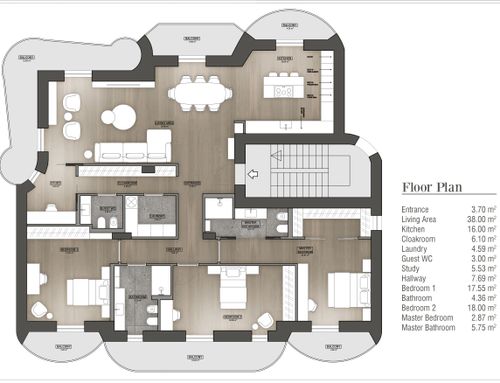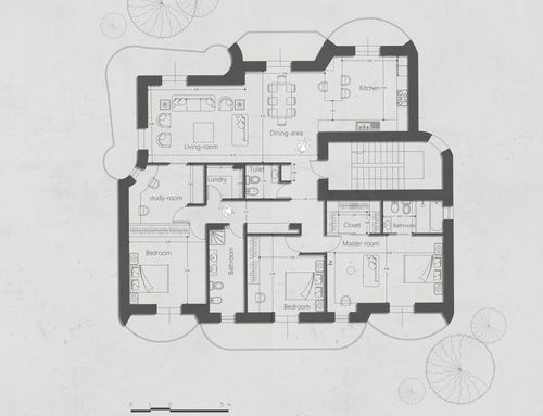 Hello, we have this apartment and would like to change the internal layout to make it more modern. The apartment should include 3 bedrooms, a living room with an open-plan kitchen (or partially separated to maintain a sense of conviviality), a study, and three bathrooms: one for guests, one ensuite for the master bedroom ideally with a walk-in closet and one serving the other two bedrooms. Finally, we also need a dedicated laundry area. We have no specific style preferences.