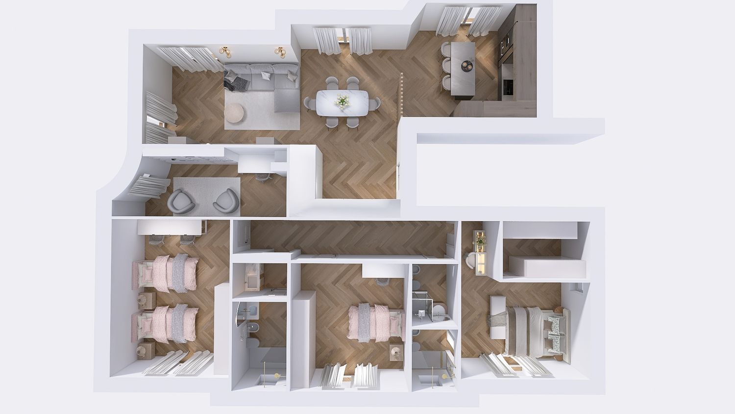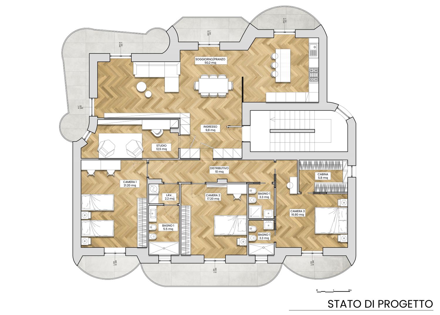 Per il vostro appartamento ho sviluppato una proposta progettuale che risponde alle esigenze che mi avete indicato: tre camere da letto, un soggiorno con cucina a vista o parzialmente separata per favorire la convivialità, uno studio, tre bagni — di cui uno per gli ospiti, uno ensuite per la camera padronale con possibilità di cabina armadio e uno a servizio delle altre due camere — oltre a uno spazio dedicato alla lavanderia.