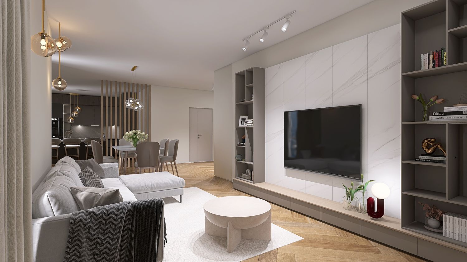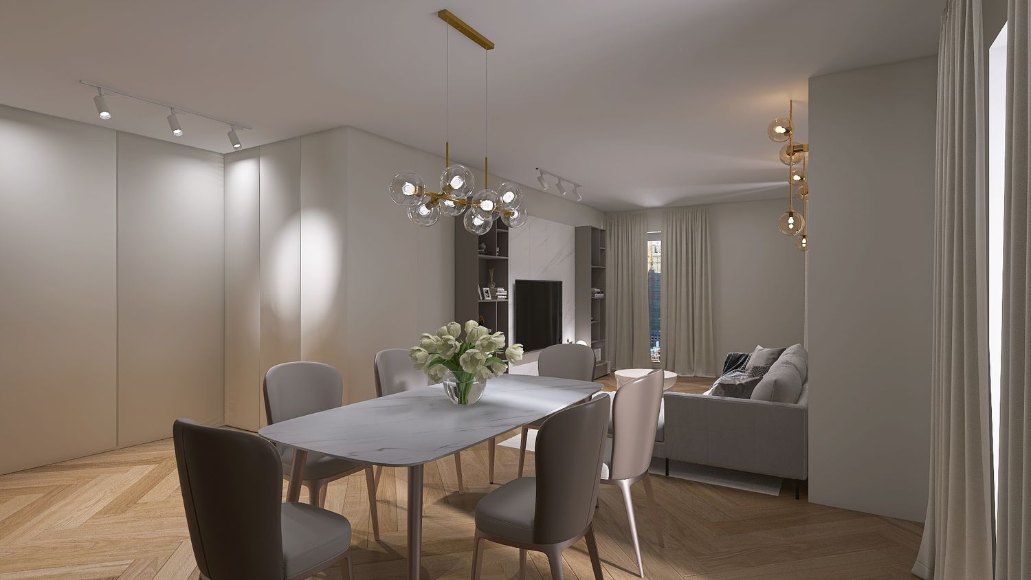 Le viste render si concentrano principalmente sulla zona giorno, pensata come cuore pulsante della casa e della vita domestica, lo spazio dedicato alla convivialità, alla condivisione e ai momenti quotidiani della famiglia.